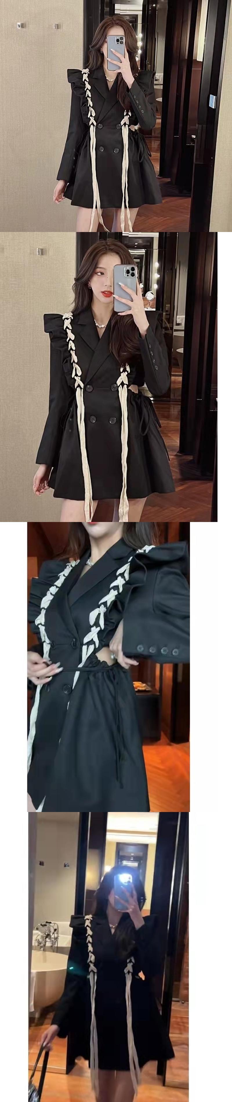 [EWQ] 長袖パッチワークレースアップブレザードレス春秋ダブルブレストブレザー Vestido 服 169 ロング スプリング 春物 オータム 秋物