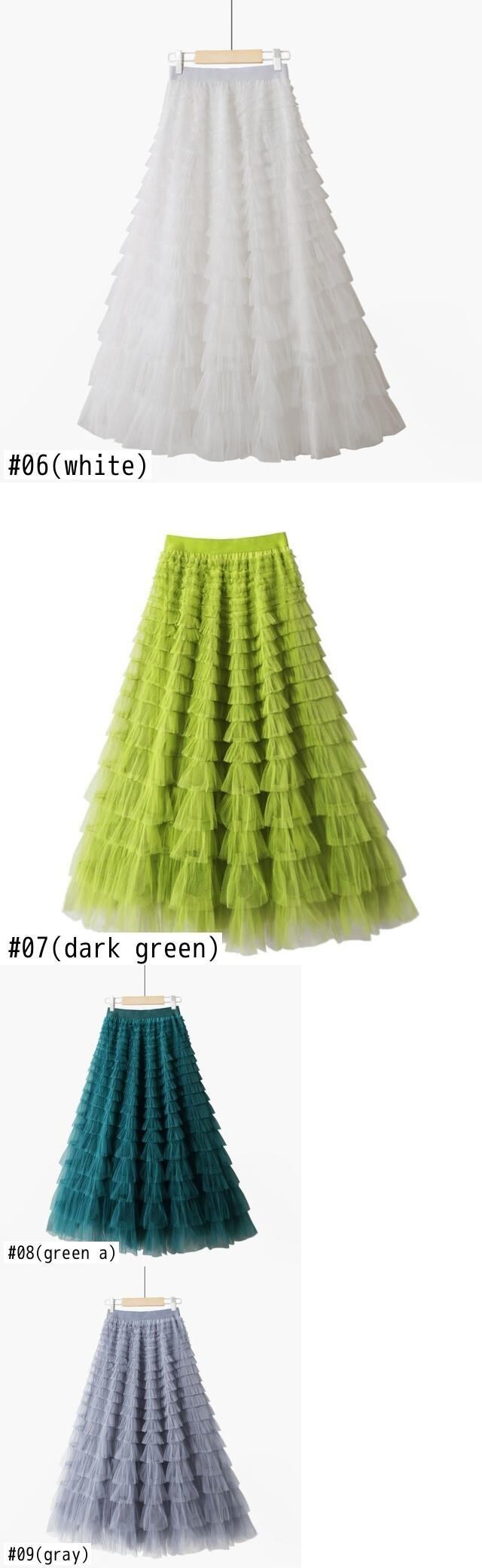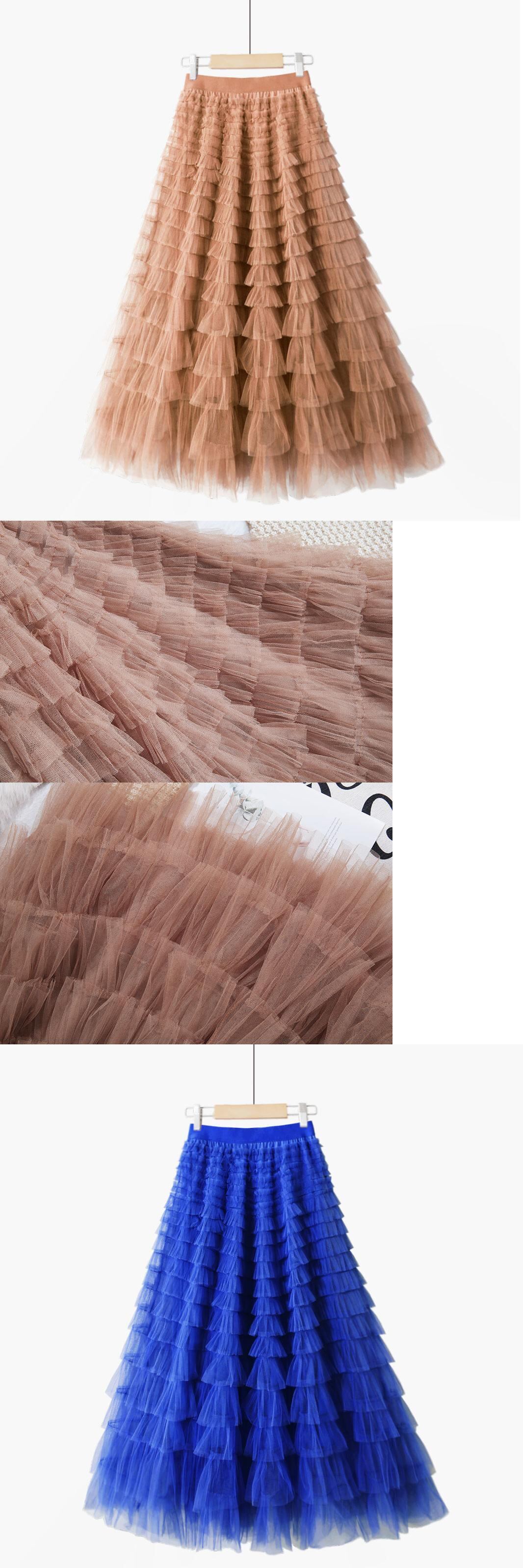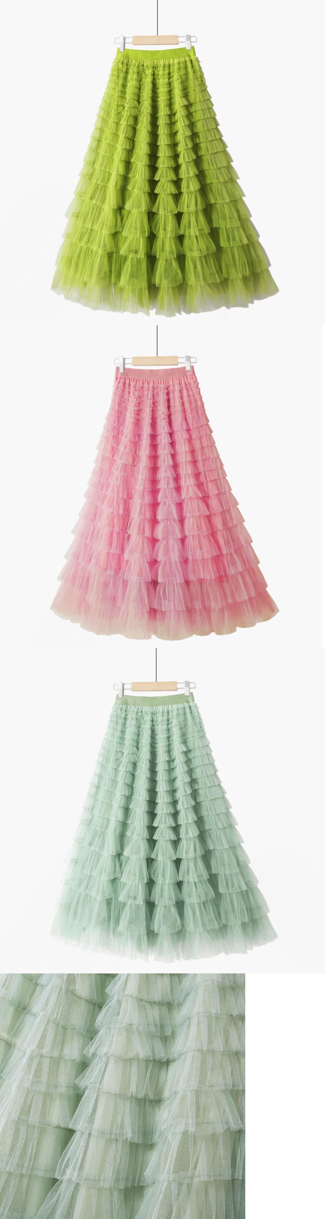 [EWQ] フリルスプライスミッドカーフスカートウエスト弾性ティアードスプライスメッシュ A ラインスカート夏潮 022 レッド エラスティック 伸縮 サマー 夏物 Aライン