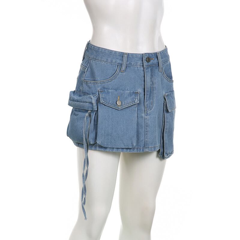 [EWQ] 3D ポケットスプライスデニムショートスカートウエストストリートグラデーションレースアップミニスカート夏潮 サマー 夏物