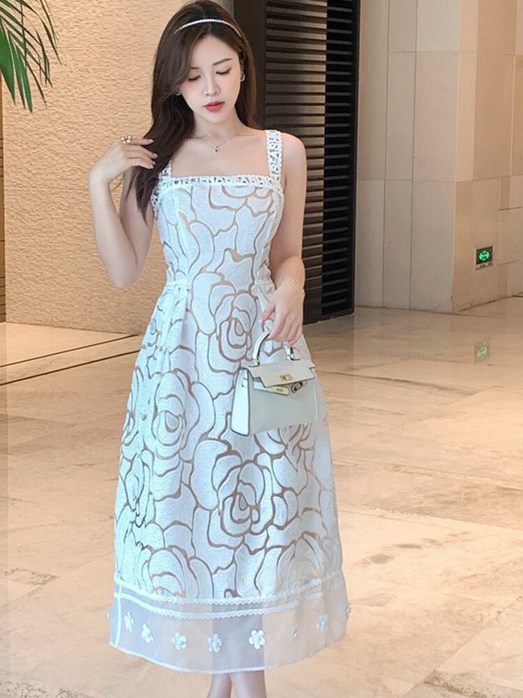 [EWQ] ローズ メッシュ透視ジャカード ドレス 3D 刺繍文字スリング ドレス夏潮 Vestido サマー 夏物