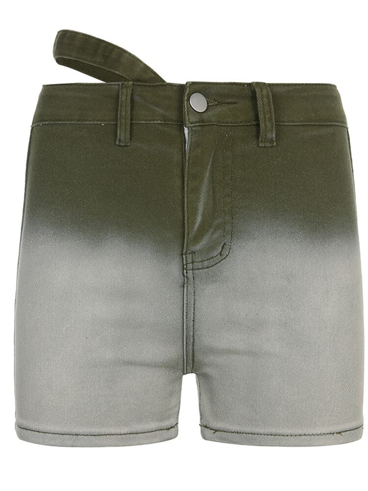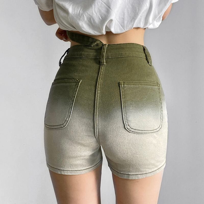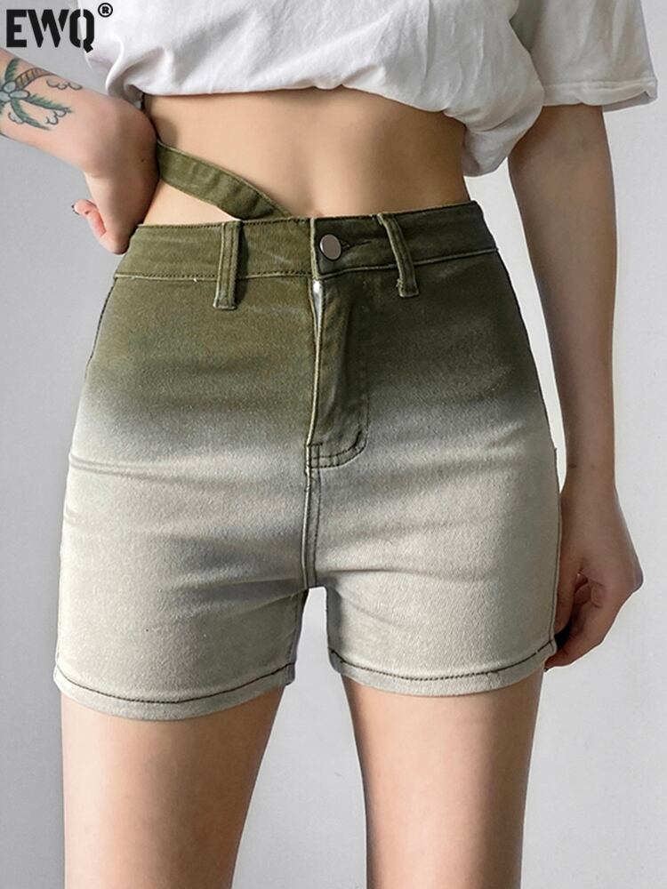 [EWQ] グラデーショングリーン不規則デニムショートパンツラップヒップポケットストリートコントラスト包帯ホットショートジーンズ夏 サマー 夏物 ショーツ ブルマー