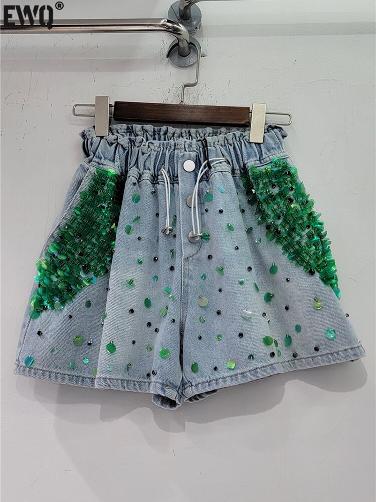 [EWQ] ビーズグリーンスパンコールデニムショートパンツストリートウエスト巾着ワイドレッグショートジーンズ夏潮 16Y8814 サマー 夏物 ショーツ ブルマー ワイドパンツ