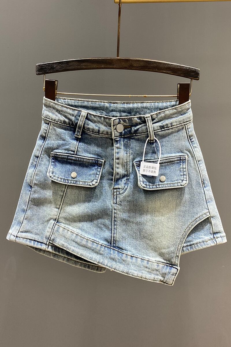 [EWQ] 不規則デニムショートスカートストリートポケットスプライススリムウエストラップヒップホットスカート夏潮 サマー 夏物