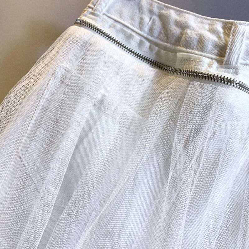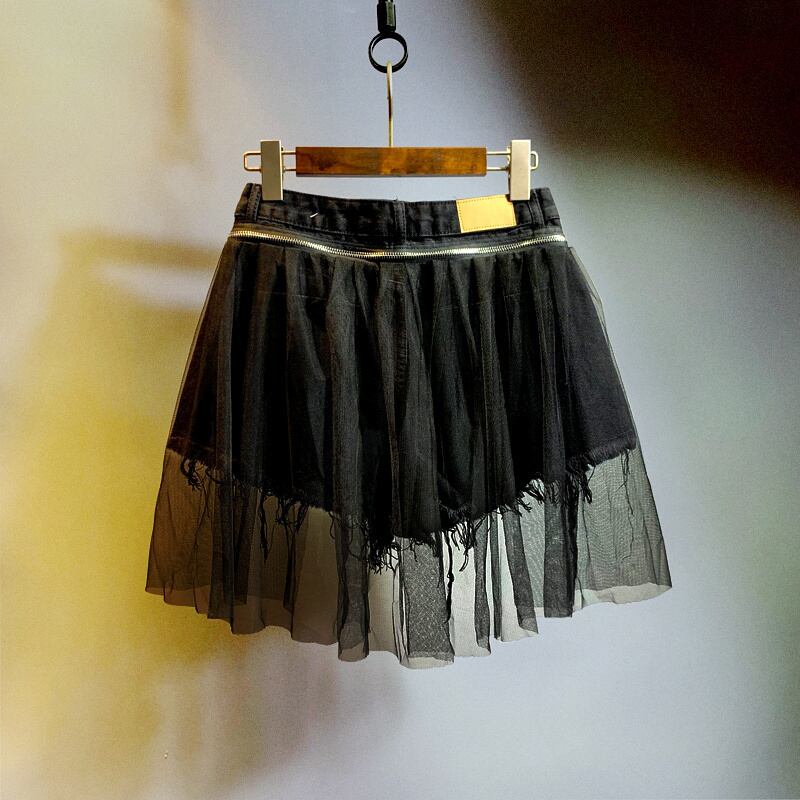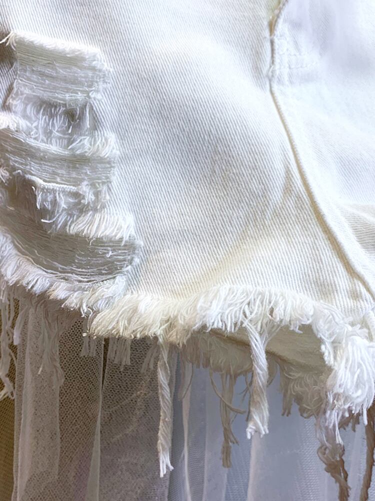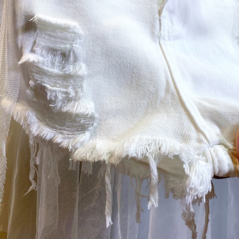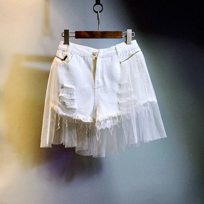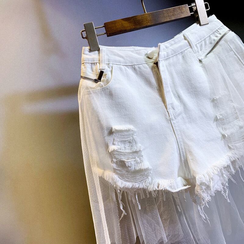 [EWQ] メッシュスプライスワイドレッグデニムショートパンツウエストパッチワークテルホールストリート夏潮ショートジーンズ29 サマー 夏物 ショーツ ブルマー ワイドパンツ