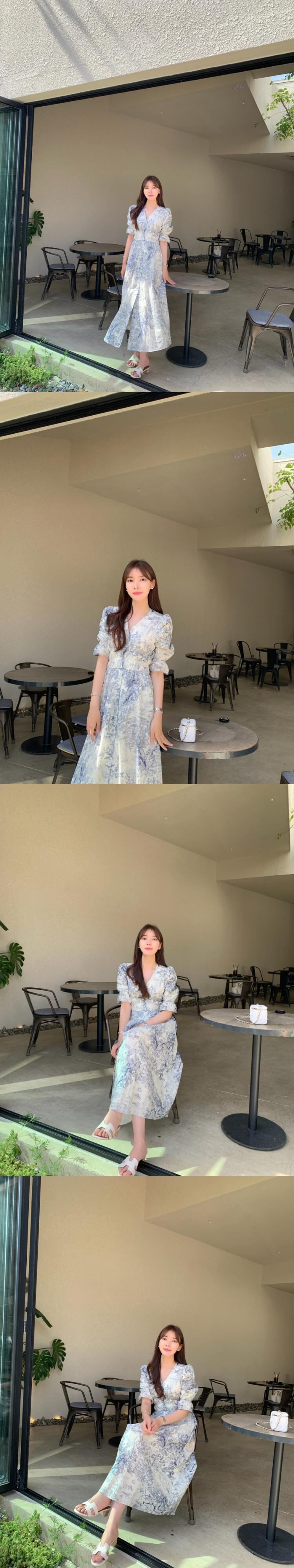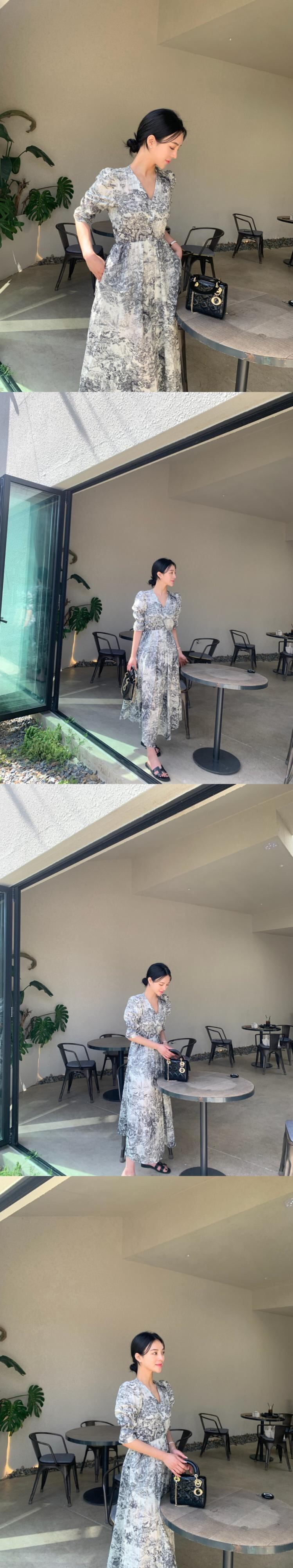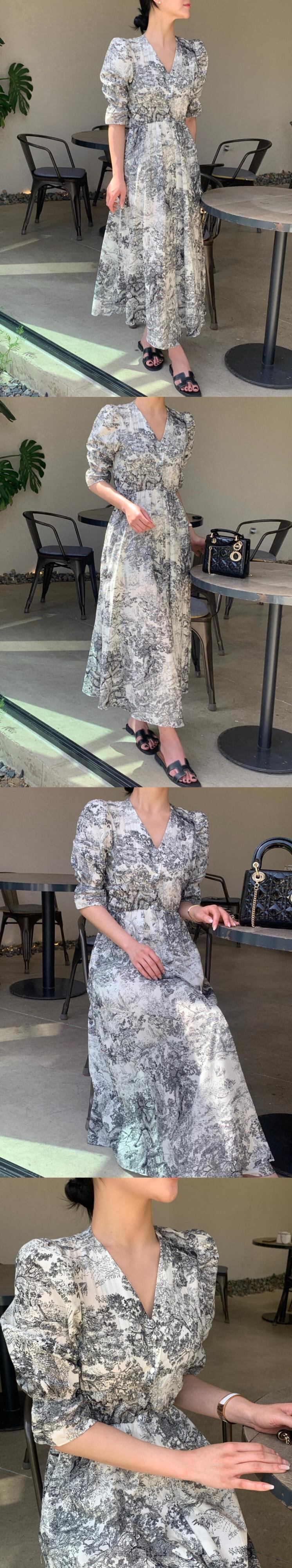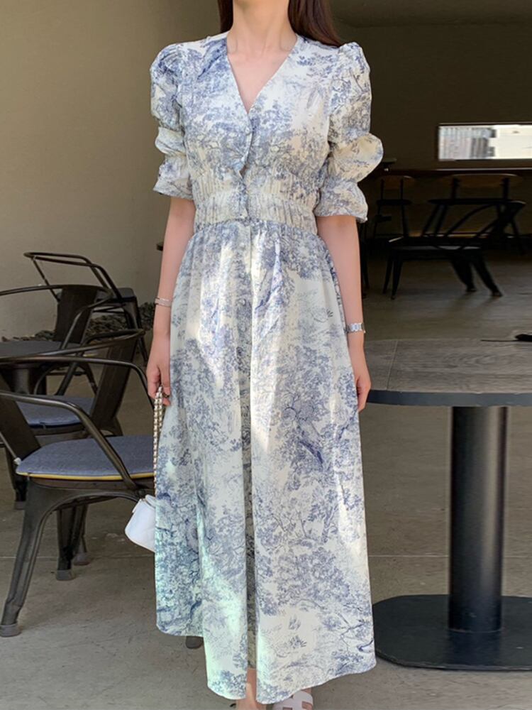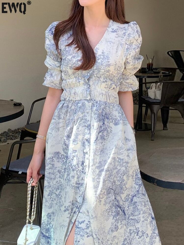 [EWQ] V ネックプリントコントラストドレスパフスリーブシフォン弾性ウエスト分割ドレス夏潮 Vestido エラスティック 伸縮 サマー 夏物 Vネック