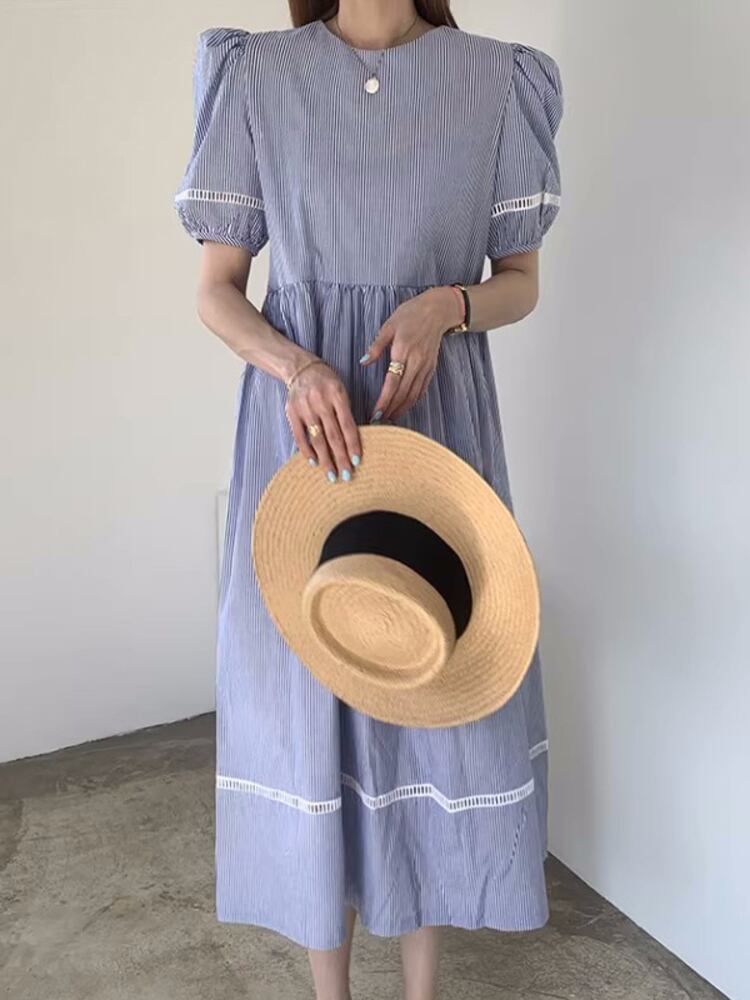 [EWQ] レース コントラスト カラー ストライプ ドレス O ネック プリーツ ウエスト パフ スリーブ ミディ ドレス夏潮 Vestido 16Y8184 サマー 夏物 Oネック