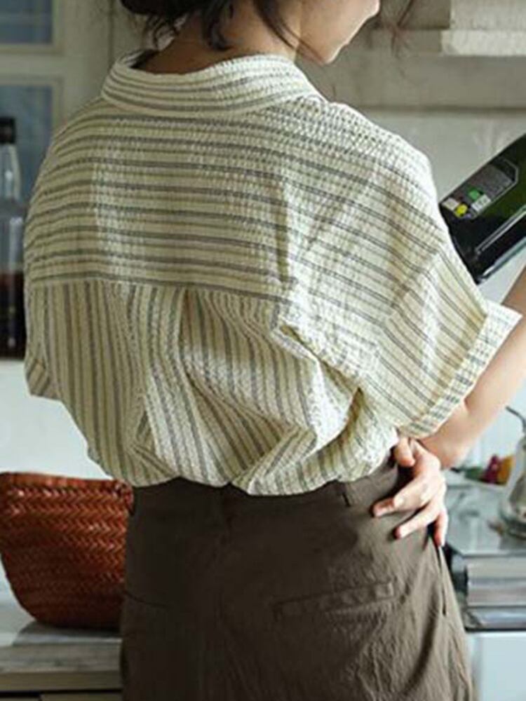 [EWQ] ストライププリーツ半袖シャツシングルブレストカジュアルブラウス夏潮気質トップ ショート ハーフスリーブ サマー 夏物
