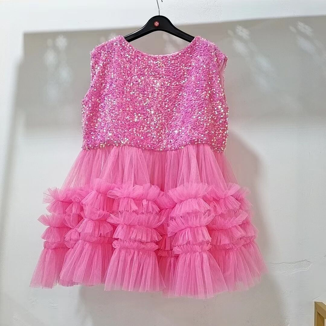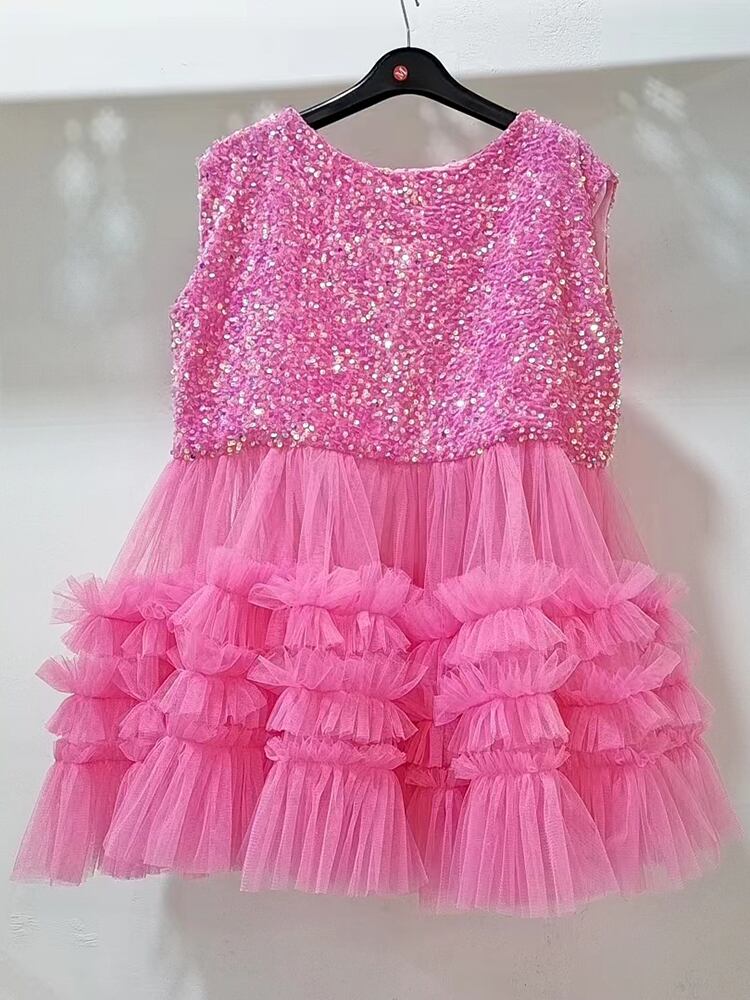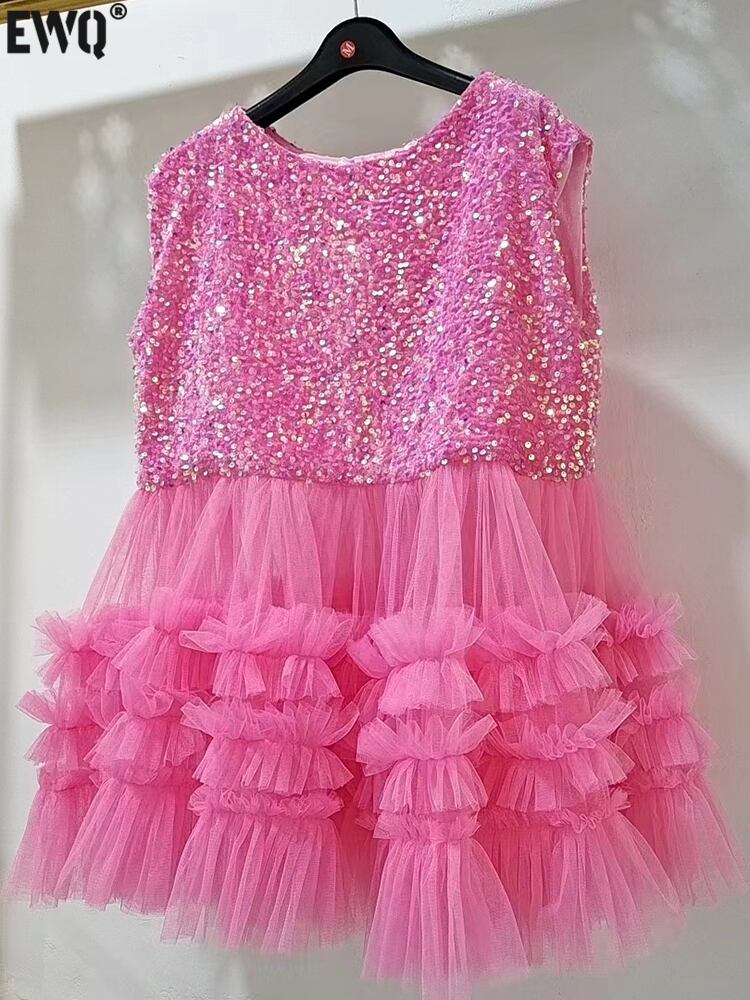 [EWQ] ピンクスパンコールメッシュパッチワークショートドレス潮 O ネック優しい気質ベストミニドレスサマーローブ 夏物 Oネック