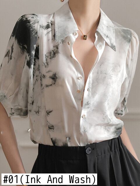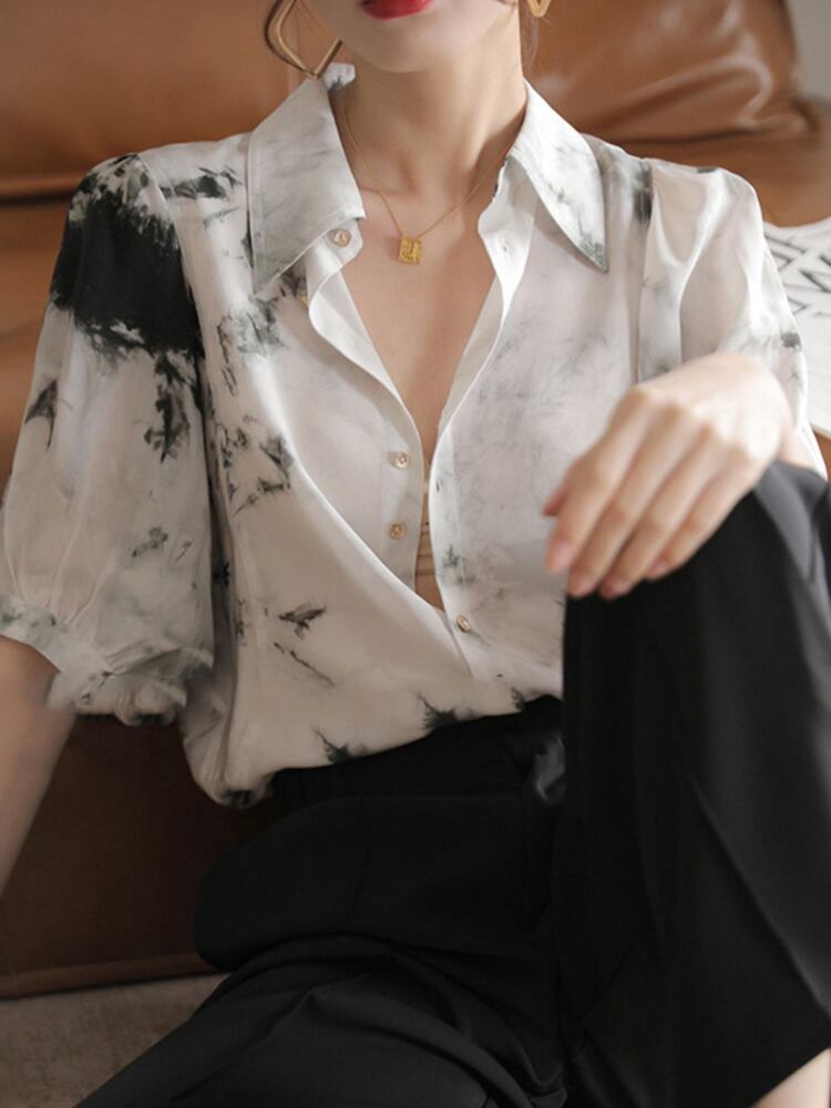 [EWQ] レディース コントラスト シフォン シャツ パフ スリーブ プリント シングルブレスト ブラウス トップ 夏潮 大きいサイズ 194 サマー 夏物