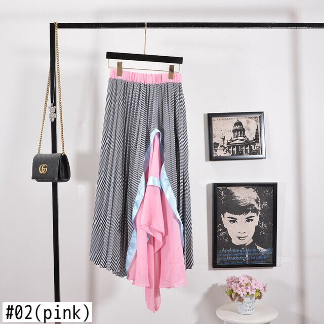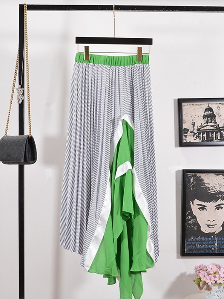 [EWQ] 不規則スプライシングフリルスカートレディースコントラストカラープリーツパッチワークウエストゴム A ラインスカート春夏 エラスティック 伸縮 スプリング 春物 サマー 夏物 Aライン