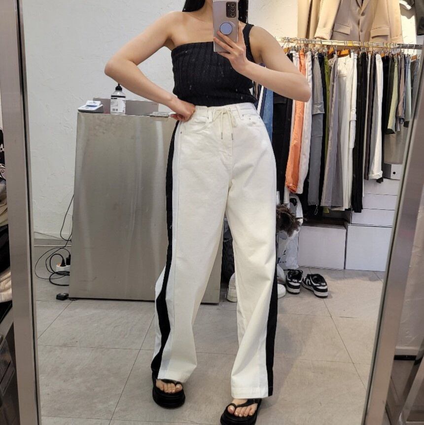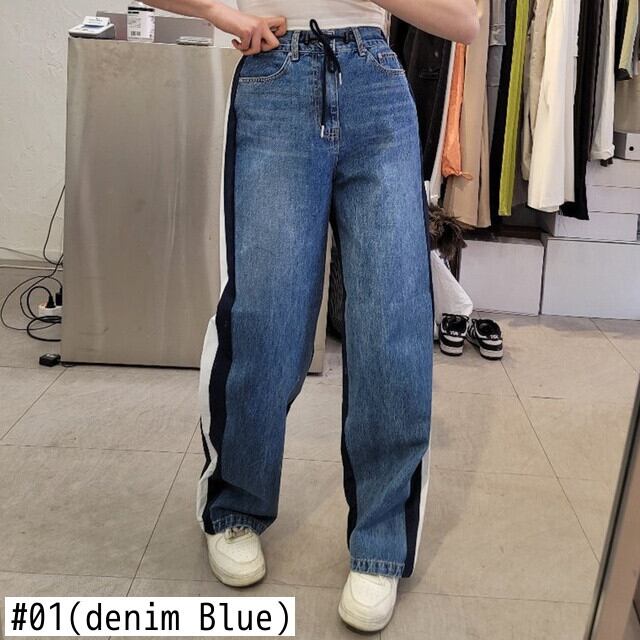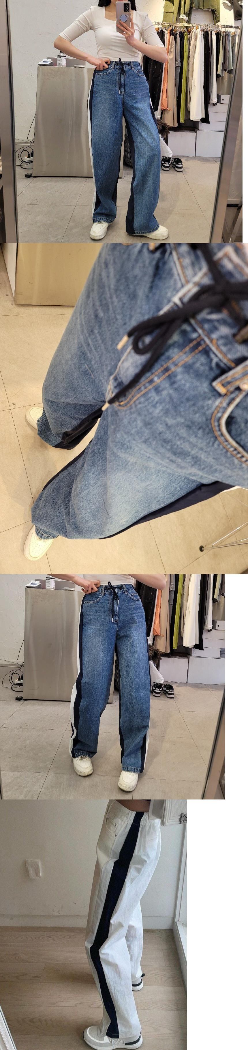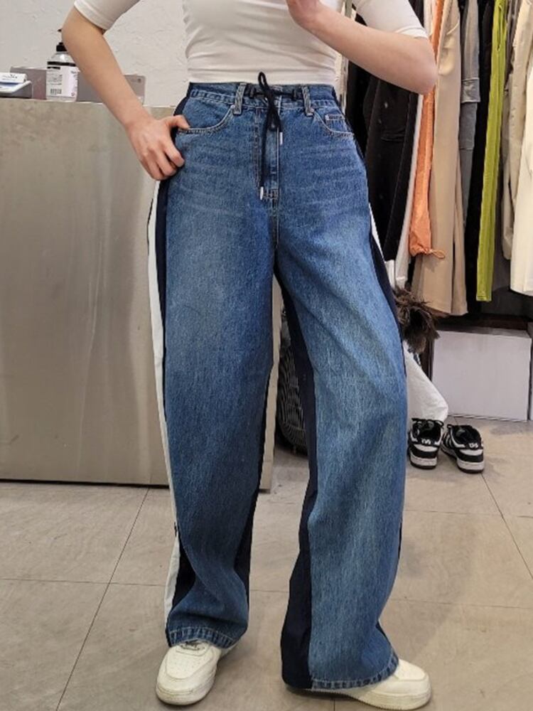 [EWQ] ウエスト巾着コントラスト デニム パンツ春夏潮パッチワーク ストリート ジーンズ ズボン スプリング 春物 サマー 夏物