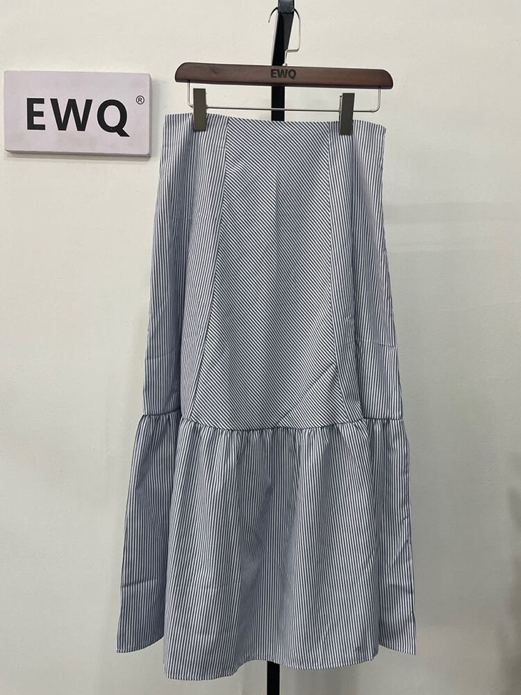[EWQ] チェック柄コントラストカラースカートフリルスプライスウエストミッドカーフスカート夏潮オールマッチ服 サマー 夏物