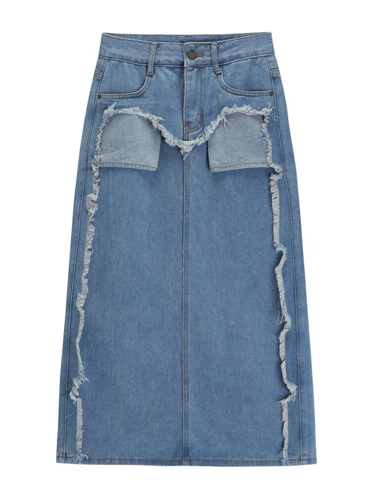 [EWQ] カットアウトノースリーブスプライスデニムジャケット + ポケットパッチワークストリートミッドふくらはぎスカート夏潮スーツ 9163 サマー 夏物