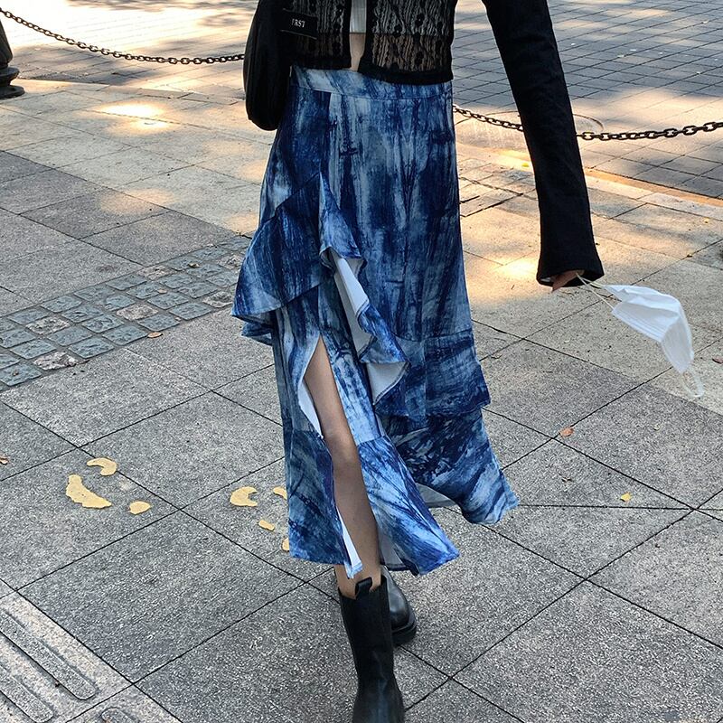 [EWQ] タイダイ A ラインスカート不規則フリルスプライスサイドスプリットミッドカーフスカート夏潮オールマッチ服 サマー 夏物 Aライン