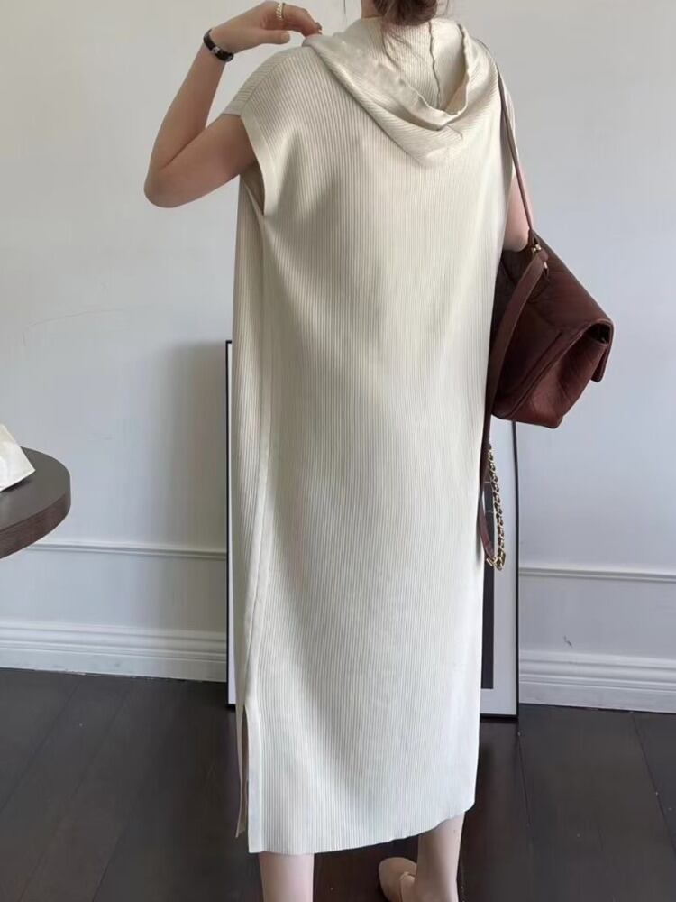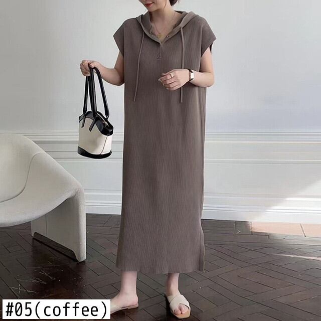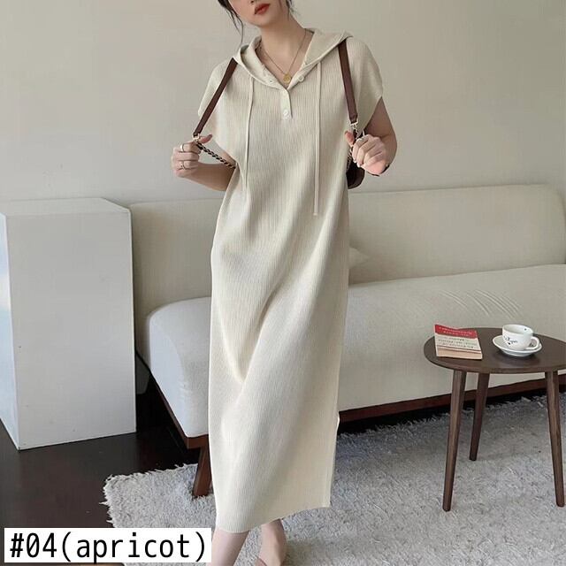 [EWQ] 半袖ニットドレスフード付きソリッドカラーロングドレス夏潮ニット Vestido 16Y9117 ショート ハーフスリーブ サマー 夏物