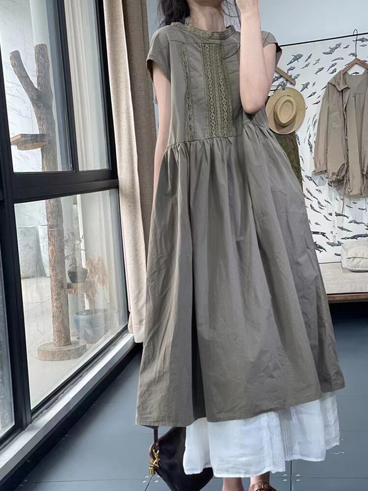 [EWQ] レーススプライシングコントラストカラーベストドレスビッグサイズパッチワーク O ネックドレス夏潮 Vestido 6Y9321 サマー 夏物 Oネック