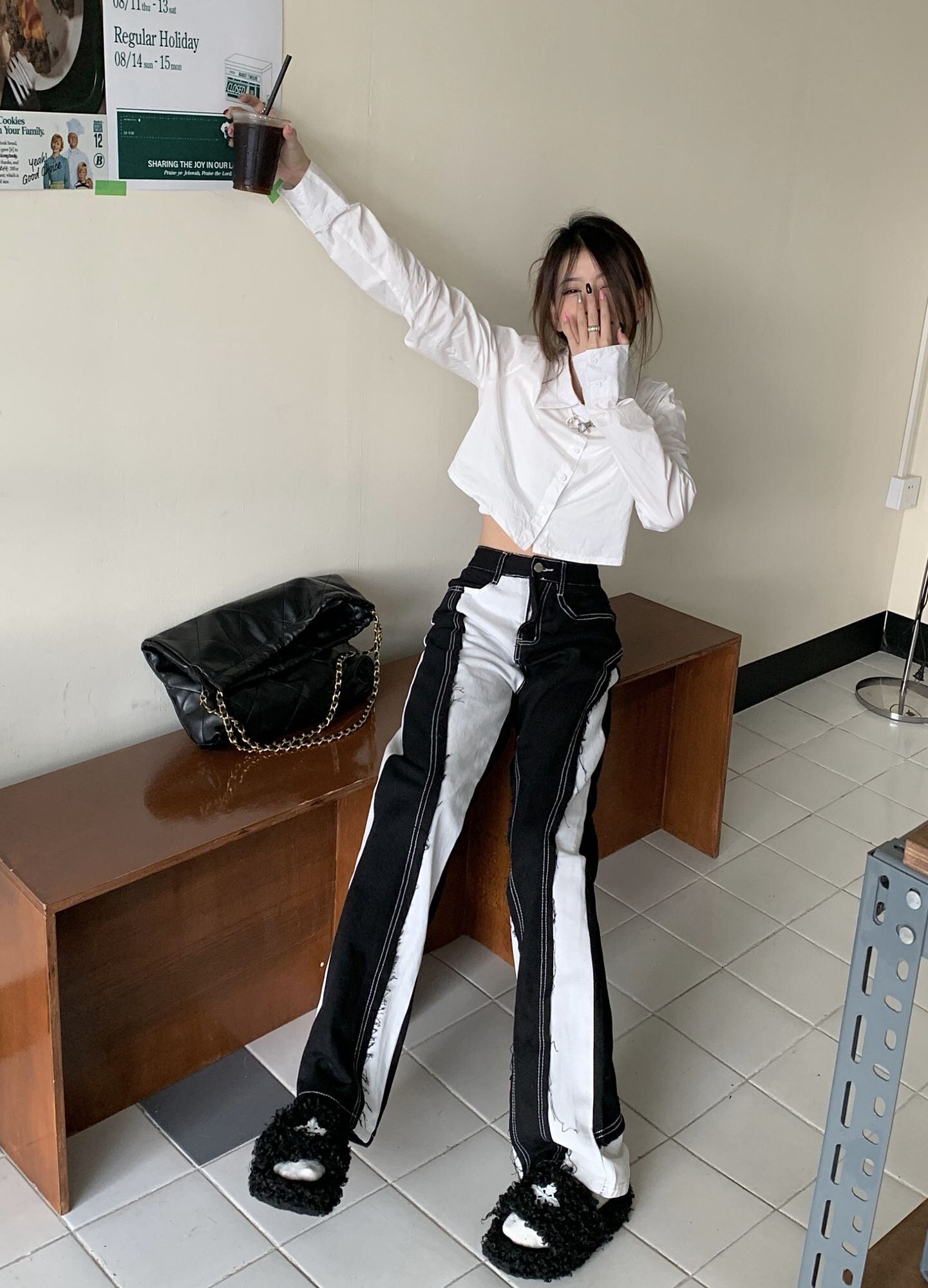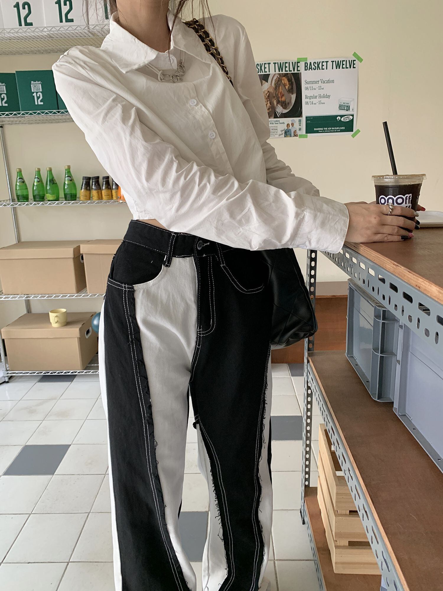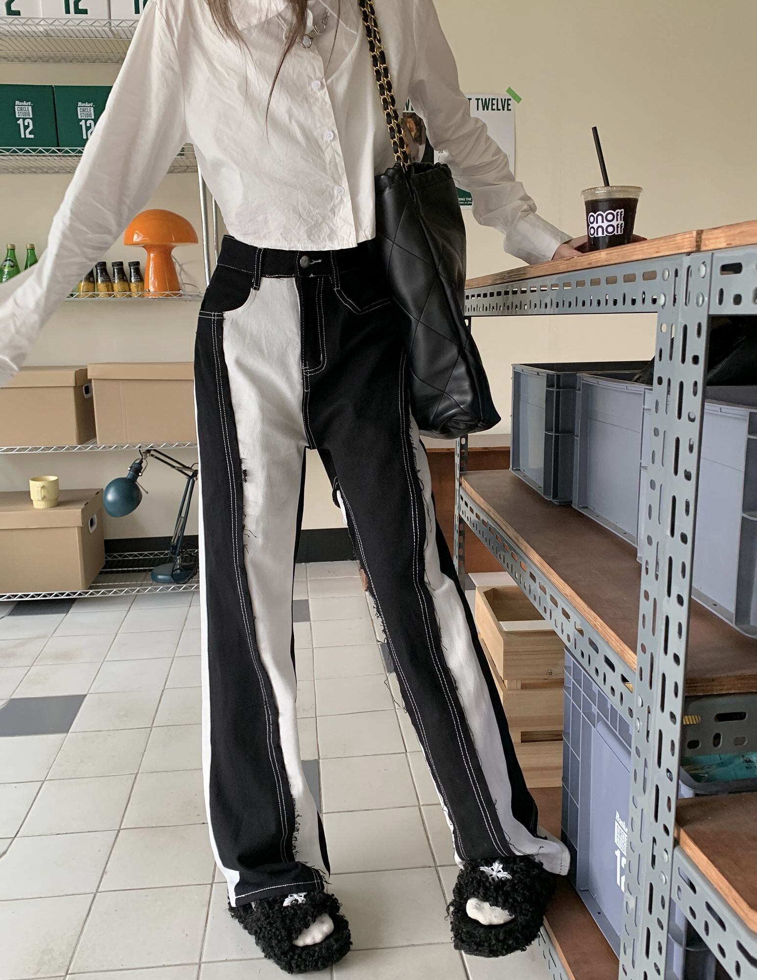 [EWQ] 不規則パッチワーク デニム パンツ レディース ストリート ブラック ホワイト コントラスト カラー ワーシト ジーンズ 夏潮 サマー 夏物