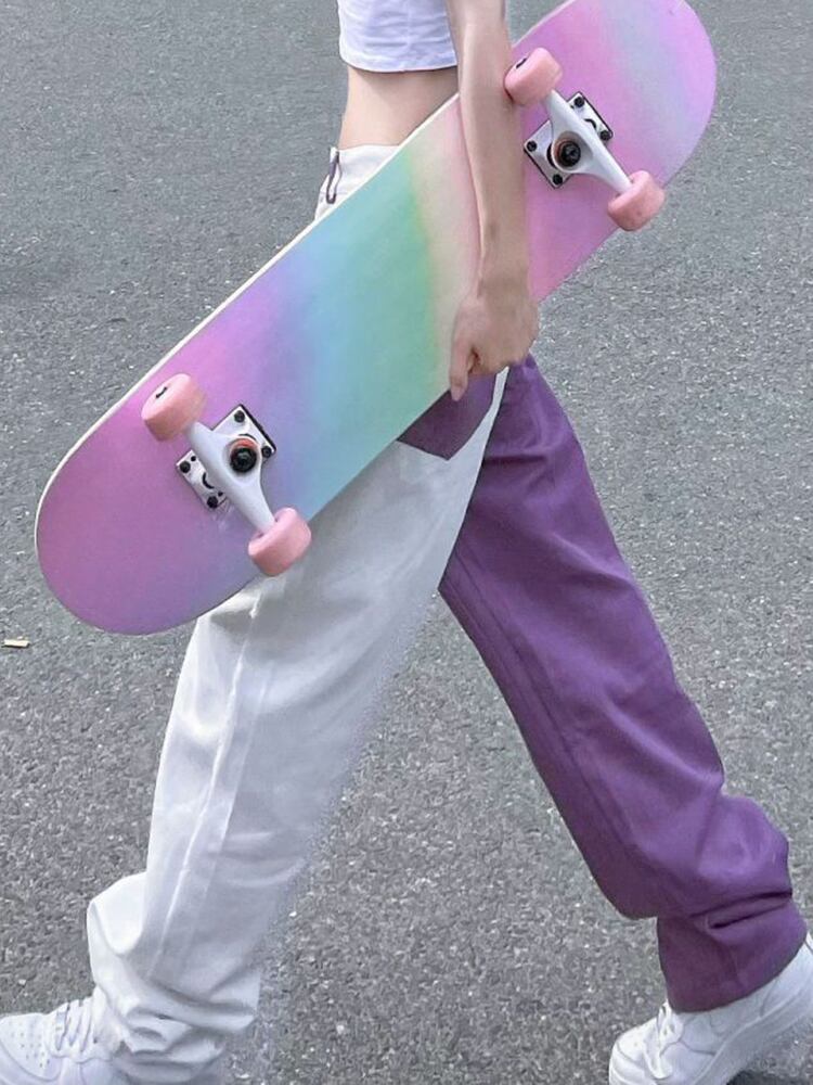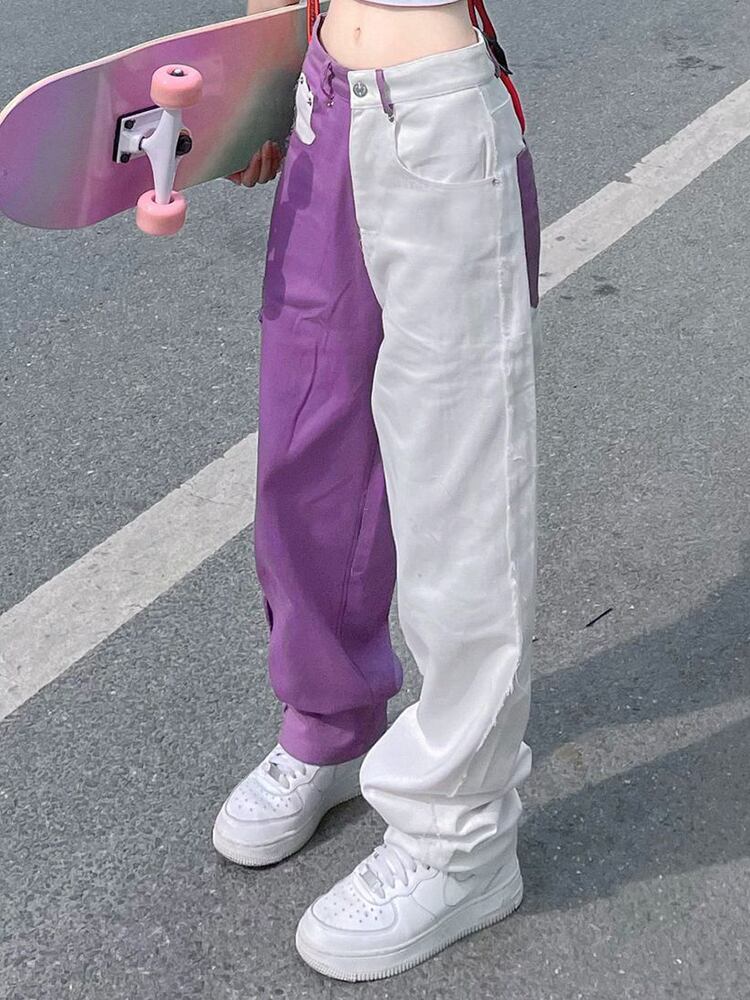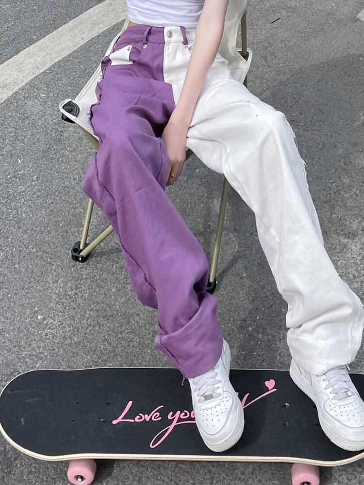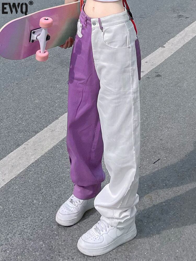 [EWQ] 不規則パッチワークジーンズ夏潮ストリートウエスト白紫コントラストデニムパンツ 6Y9350 ホワイト サマー 夏物 パープル