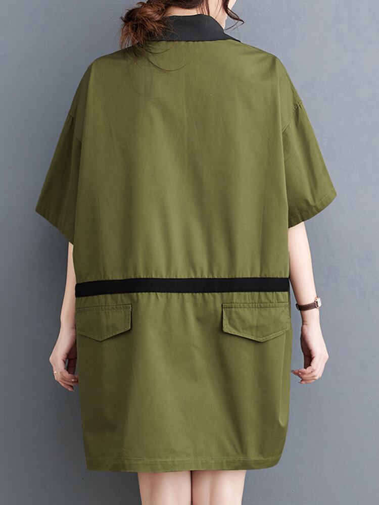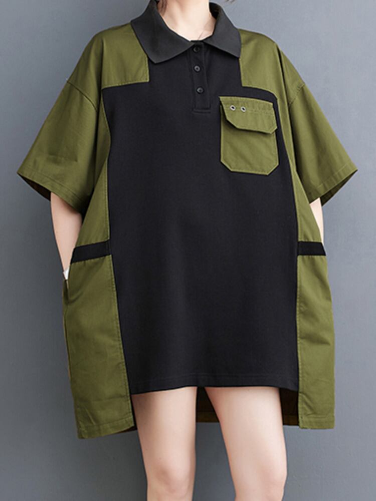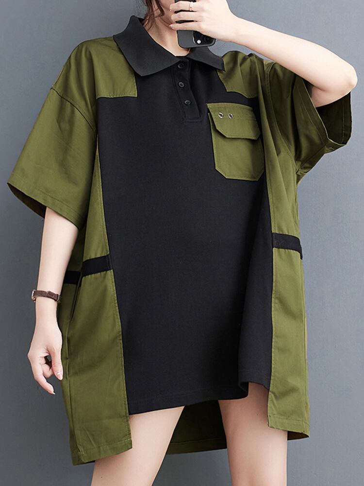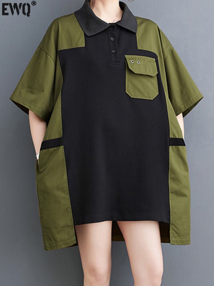 [EWQ] コントラストスプライシングビッグサイズシャツドレスグリーンブラックコントラスト半袖ルーズポケットドレス夏 Vestido ショート ハーフスリーブ サマー 夏物