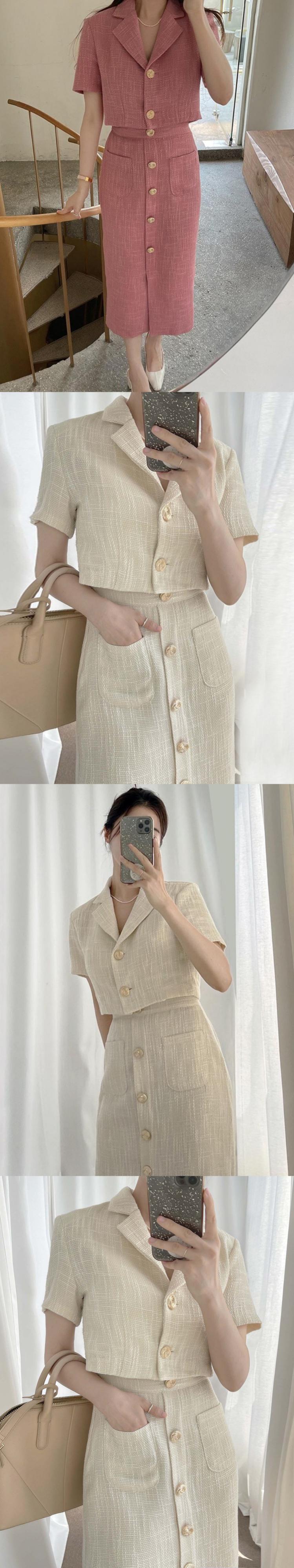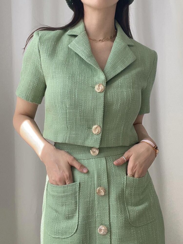 【EWQ】エイブルラペル 薄手ツイード グリーン Sサイズスーツ ショートジャケット+ウエストシックボタンスリムスカート 2点セット 16Y2826