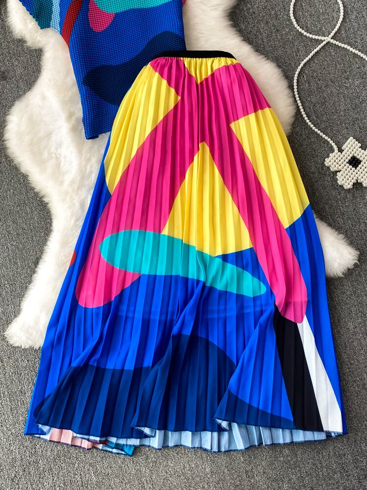 [EWQ] レディース半袖プリントスリムショートトップツーピーススーツウエストプリーツAラインスカート夏潮セット ハーフスリーブ サマー 夏物