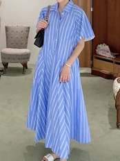 [EWQ] ストライプシャツドレスシングルブレストルーズ因果半袖コントラストカラードレス夏潮 Vestidos ショート ハーフスリーブ サマー 夏物