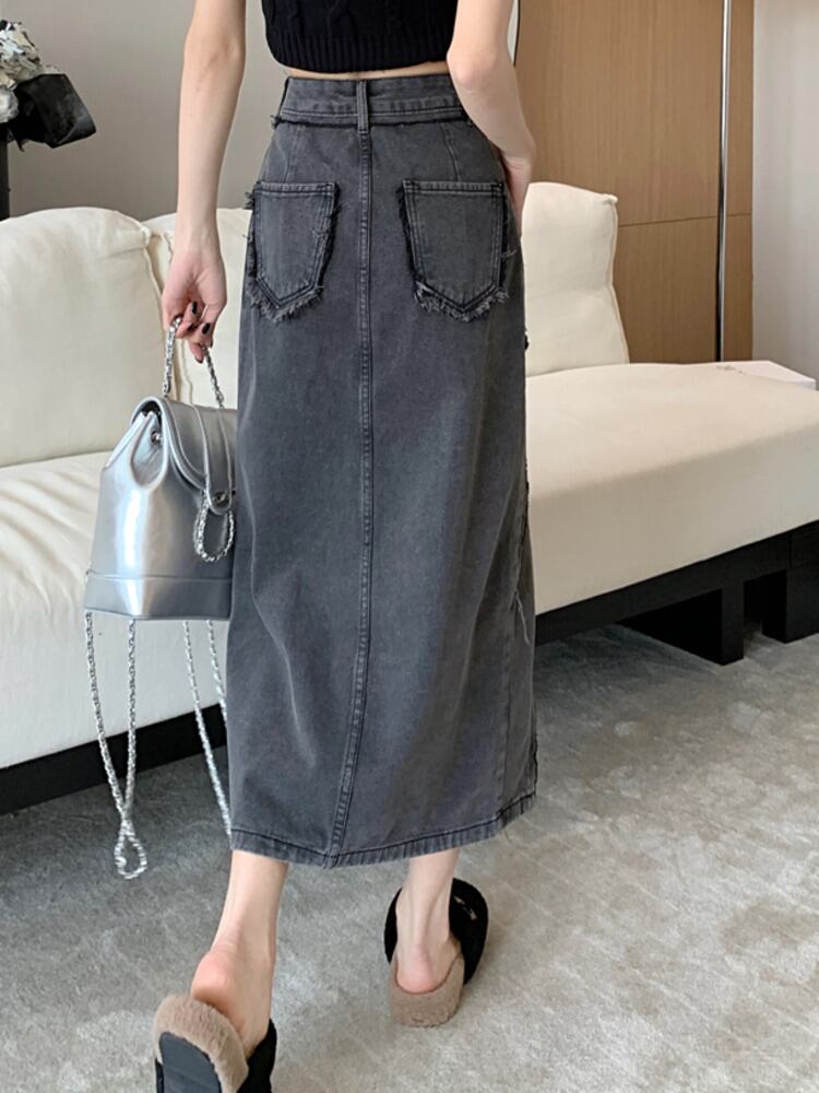 [EWQ] ストリートデニムスカートパッチワークテルポケットウエストラップヒップスプリットストレートスカート夏潮 Y9361 サマー 夏物