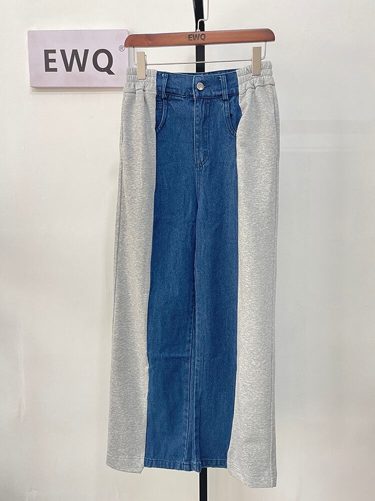 [EWQ] デニムパッチワークパンツウエストストリートワイドレッグパンツ春夏潮オールマッチ服 スプリング 春物 サマー 夏物 ワイドパンツ