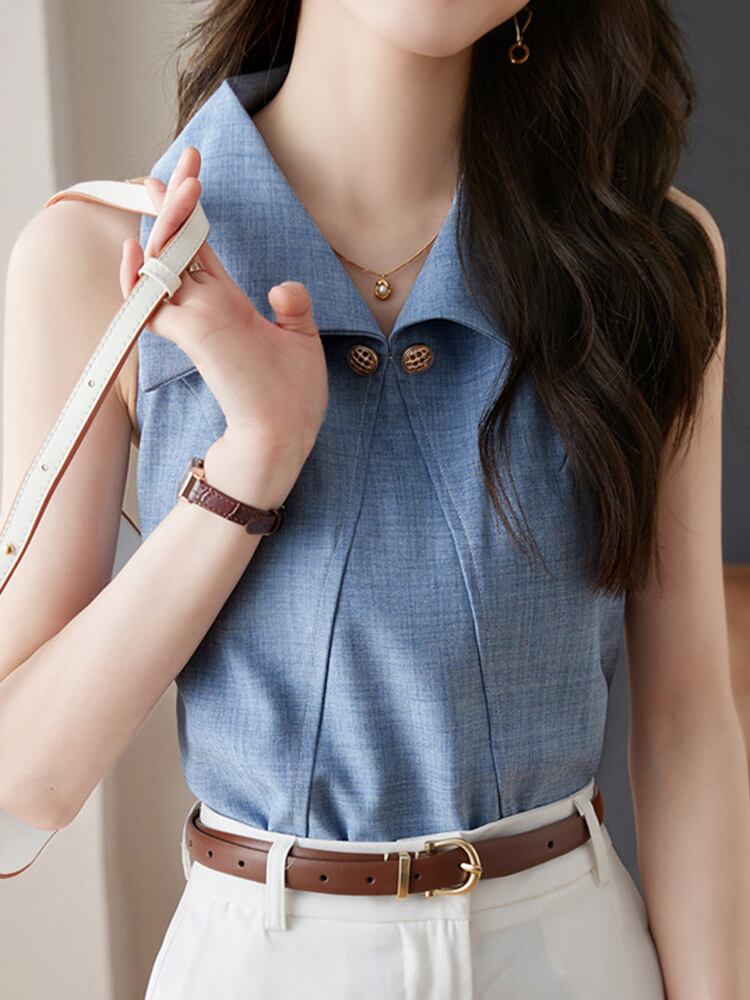 [EWQ] 2 ボタン装飾シャツ ブルー オフショルダー ラペル トップ夏潮気質トップス 16Y9179 サマー 夏物