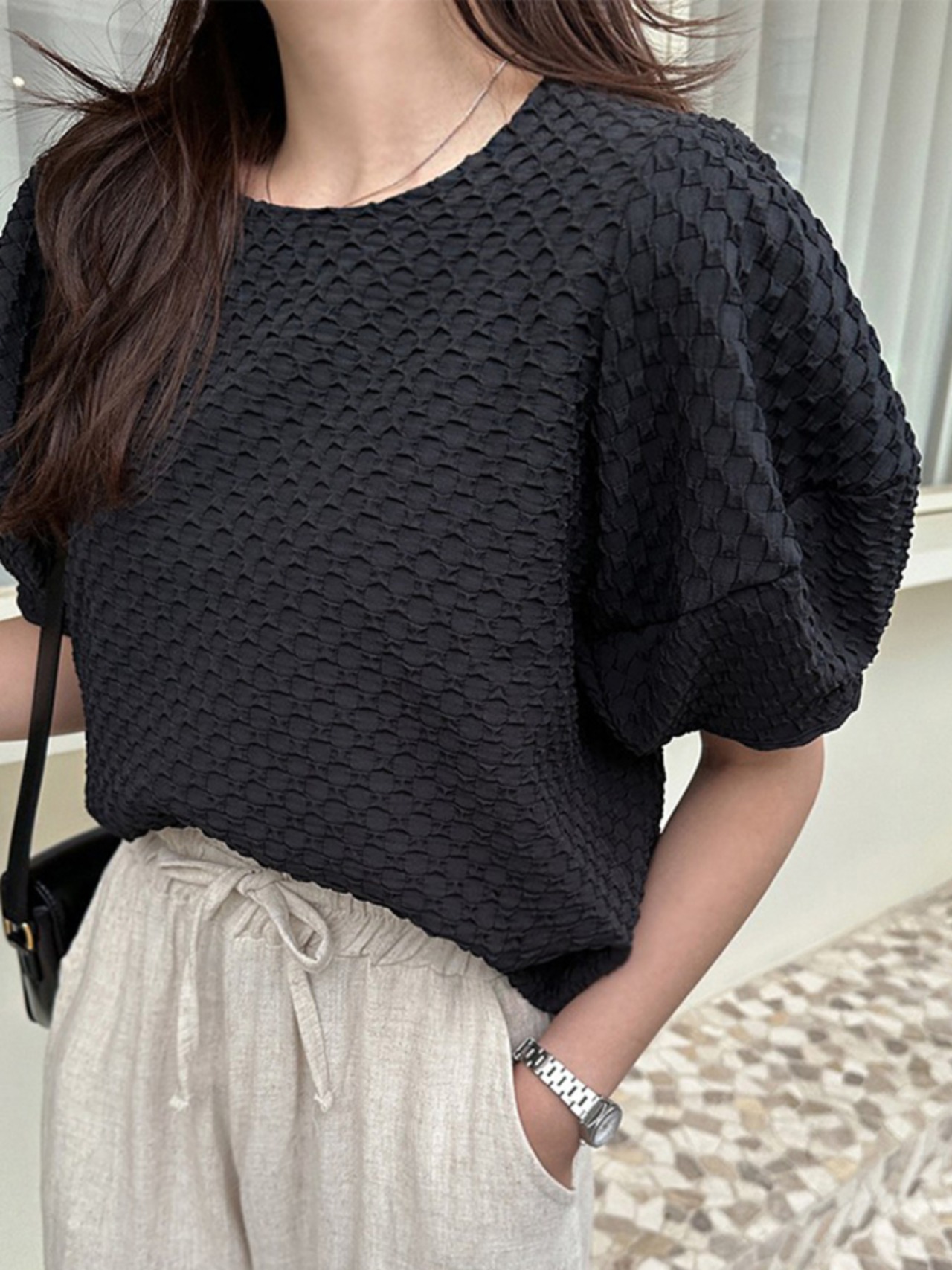 [EWQ] 甘い 3D ダイヤモンド チェック シャツ ルーズ カジュアル ランタン スリーブ O ネック ブラウス トップ サマー ジャカード ピンク トップス 6Y9077 レッド ランタンスリーブ 大人ガーリー スウィート キュート 夏物 Oネック