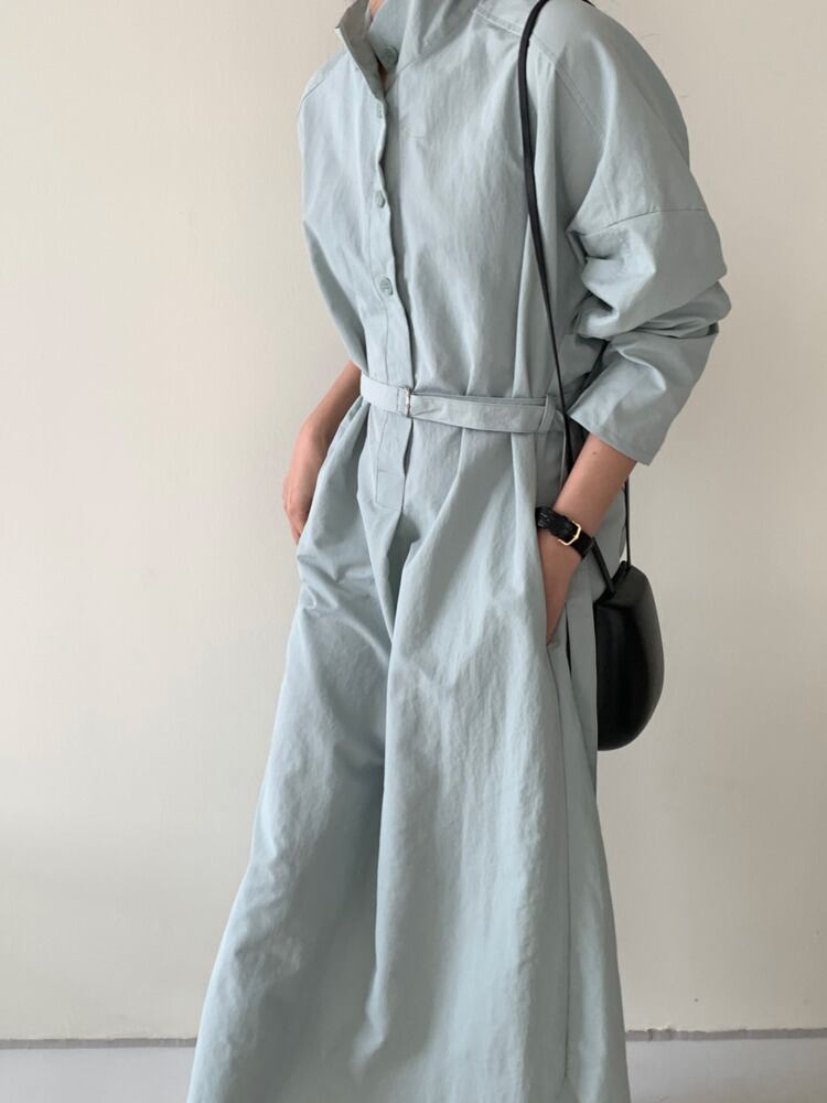 [EWQ] ミニマリストスタンドカラーレースアップドレスソリッドカラーボタンドレス春秋 Vestido スプリング 春物 オータム 秋物