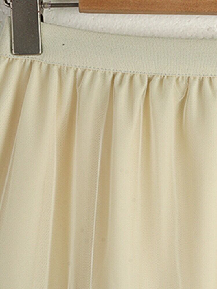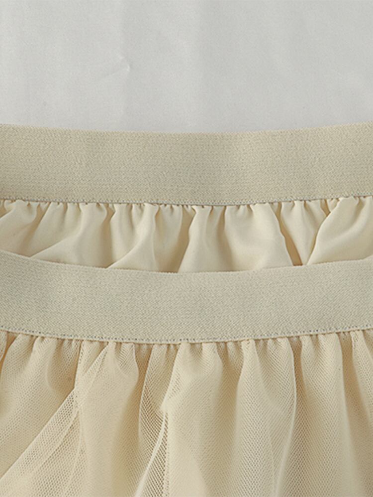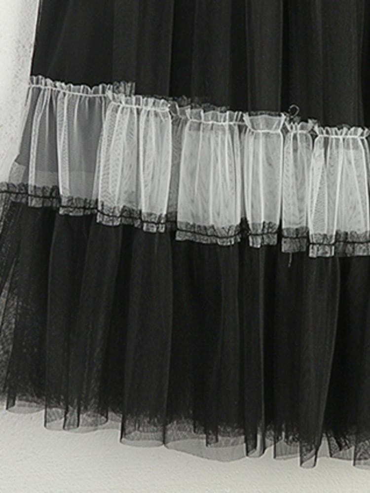 [EWQ] カラーコントラストフリルスプライスメッシュスカートウエストパッチワークガーゼミッドカーフスカート春夏 58 スプリング 春物 サマー 夏物