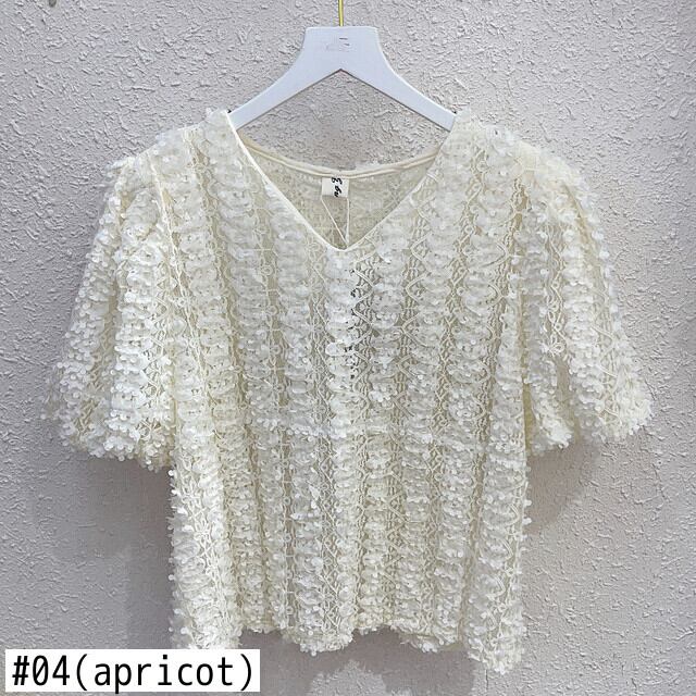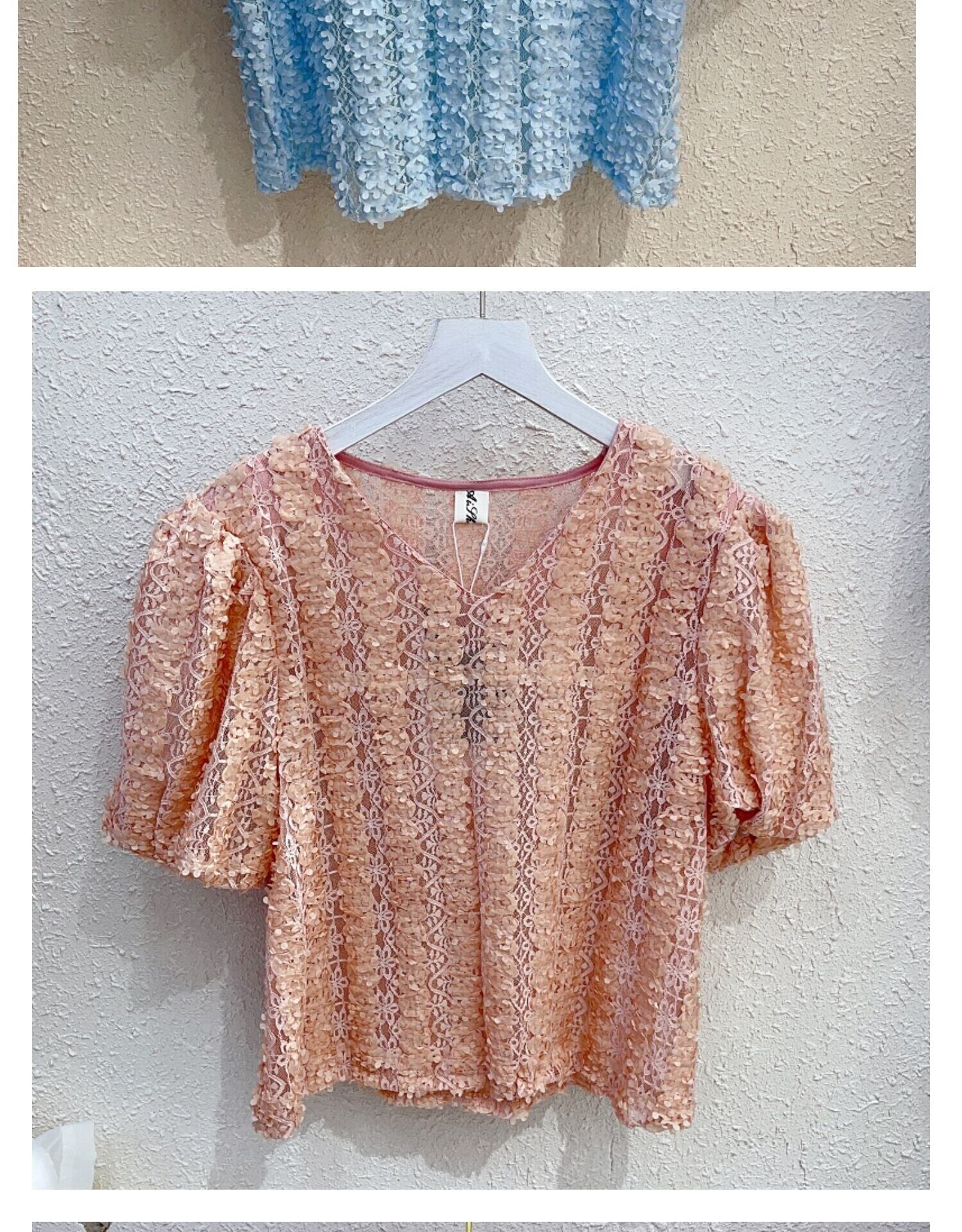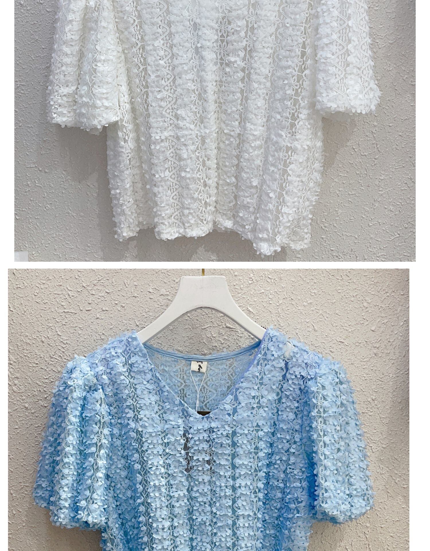 [EWQ] 甘い視点レースフックフラワーシャツ V ネックバブルスリーブ無地ルーズブラウストップ夏トップス 8063 大人ガーリー スウィート キュート カジュアル サマー 夏物 Vネック ソリッドカラー フラワーデザイン
