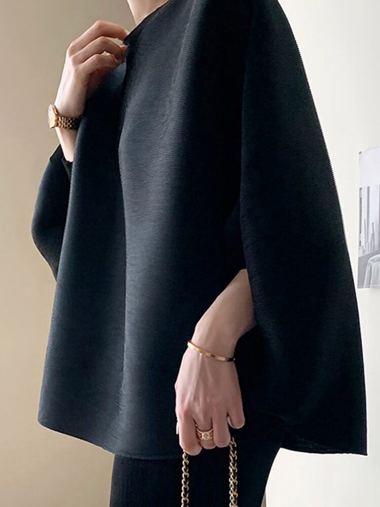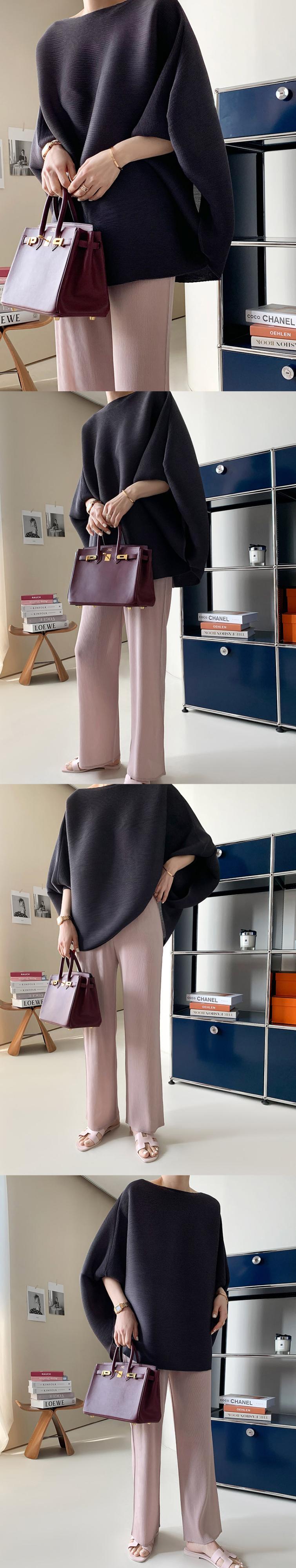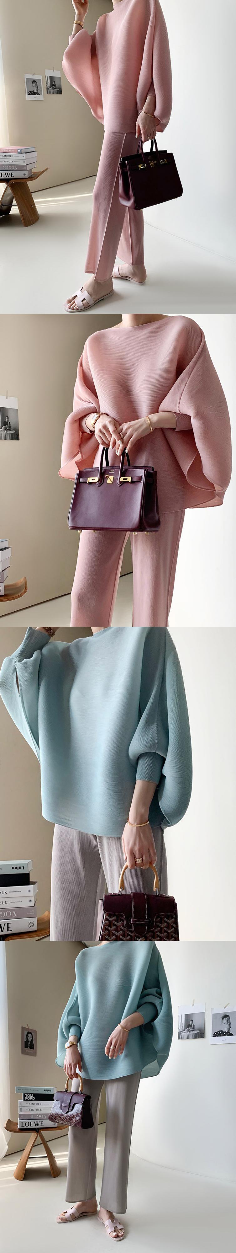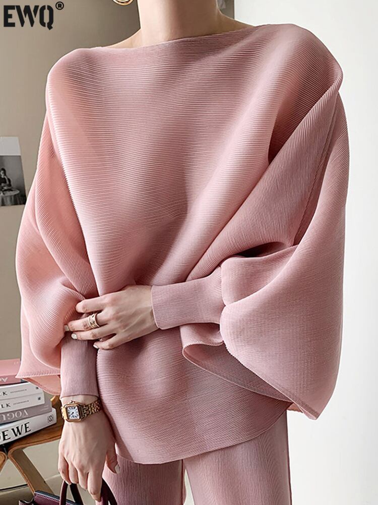 [EWQ] ランタンスリーブ折り目シャツ O ネックルーズ因果プリーツピンクトップ夏潮シャツ 16Y9344 サマー 夏物 Oネック