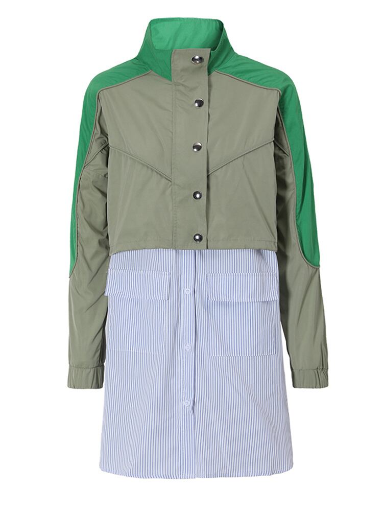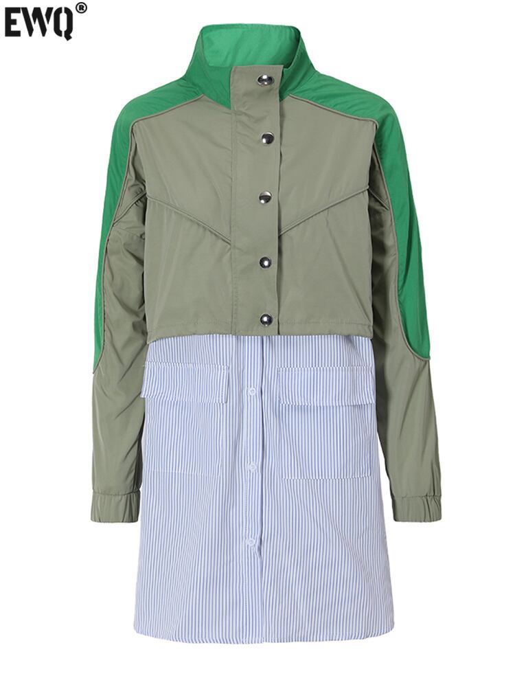 [EWQ] ストライプビッグサイズグリーンカラーブロックシャツドレスラペル長袖ルーズフィット春秋 YF272105 ロング スプリング 春物 オータム 秋物