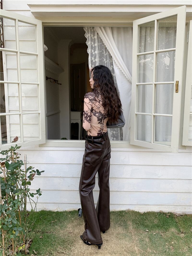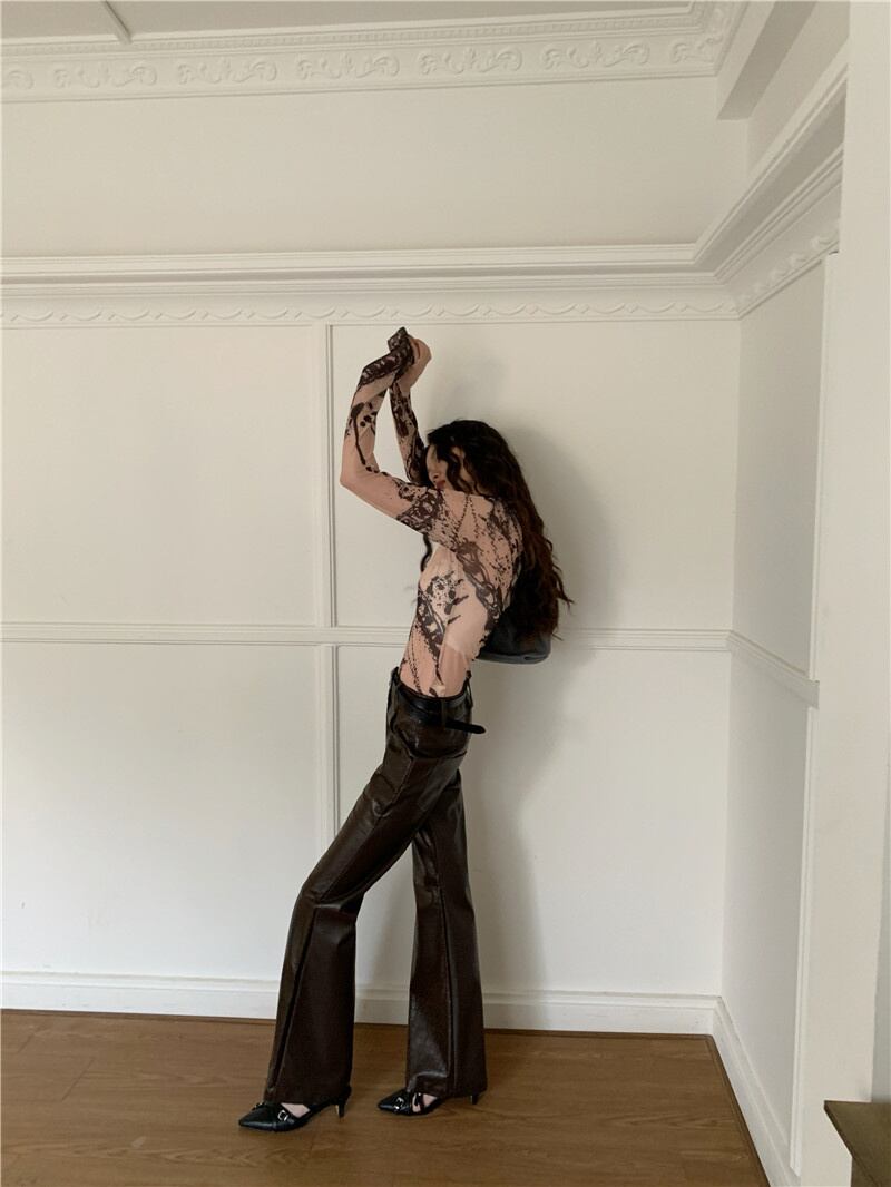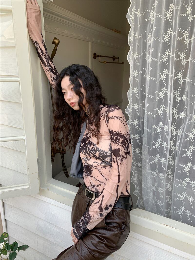 [EWQ] セクシープリントメッシュボトム Tシャツ長袖スリムフィット弾性 Tシャツ O ネックコントラストカラー春潮トップス ロング エラスティック 伸縮 スプリング 春物 Oネック