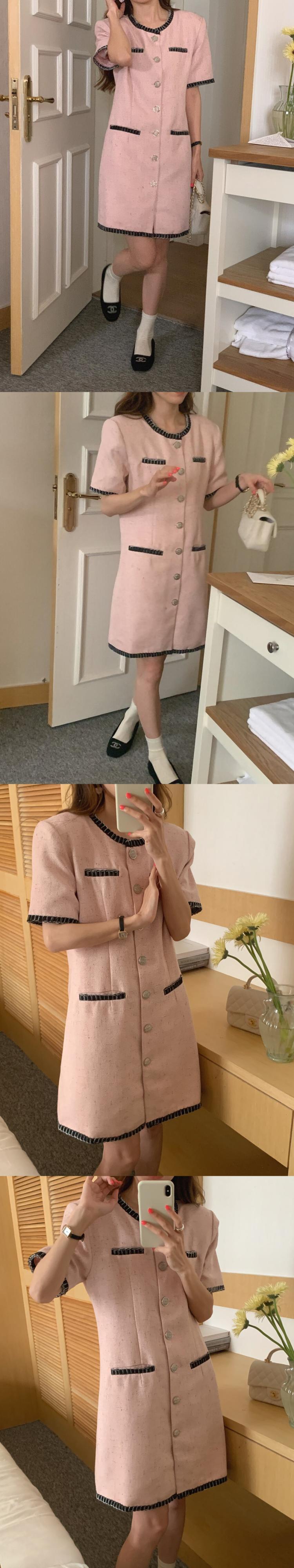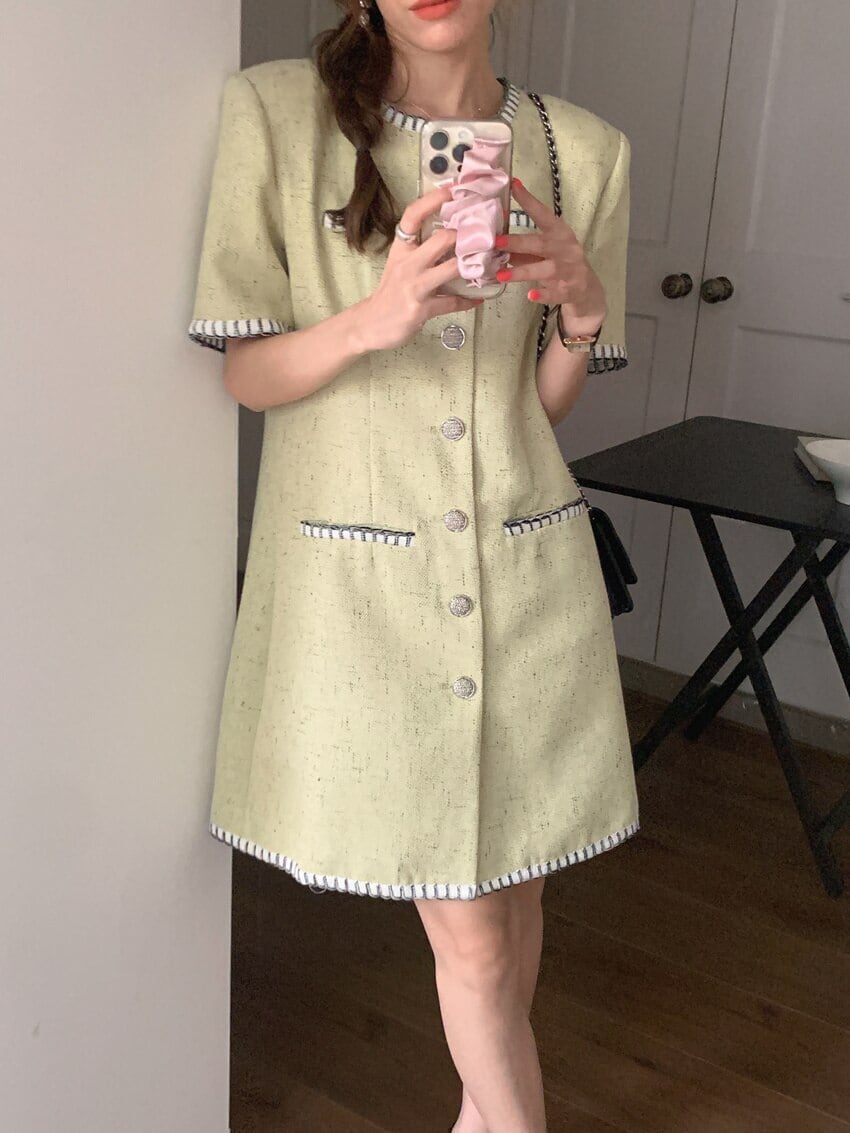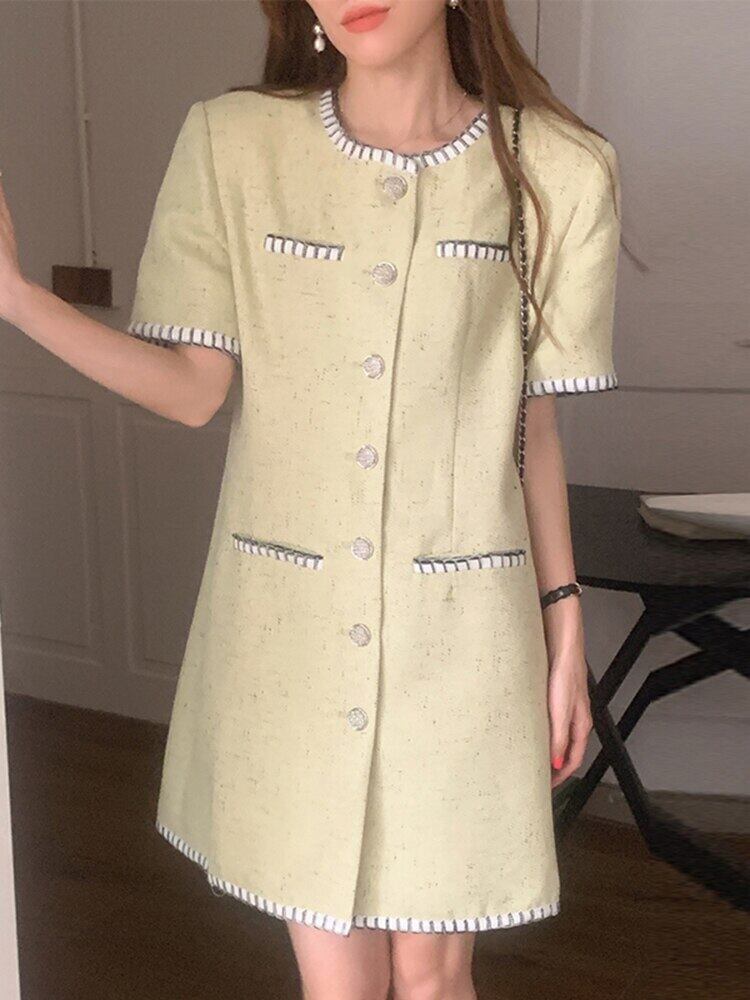 [EWQ] コントラストカラーラインツイードドレスシングルブレストルーズ半袖パッチワークドレス夏潮 Vestidos ショート ハーフスリーブ サマー 夏物