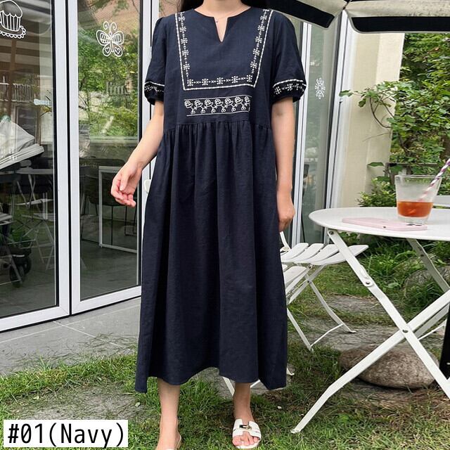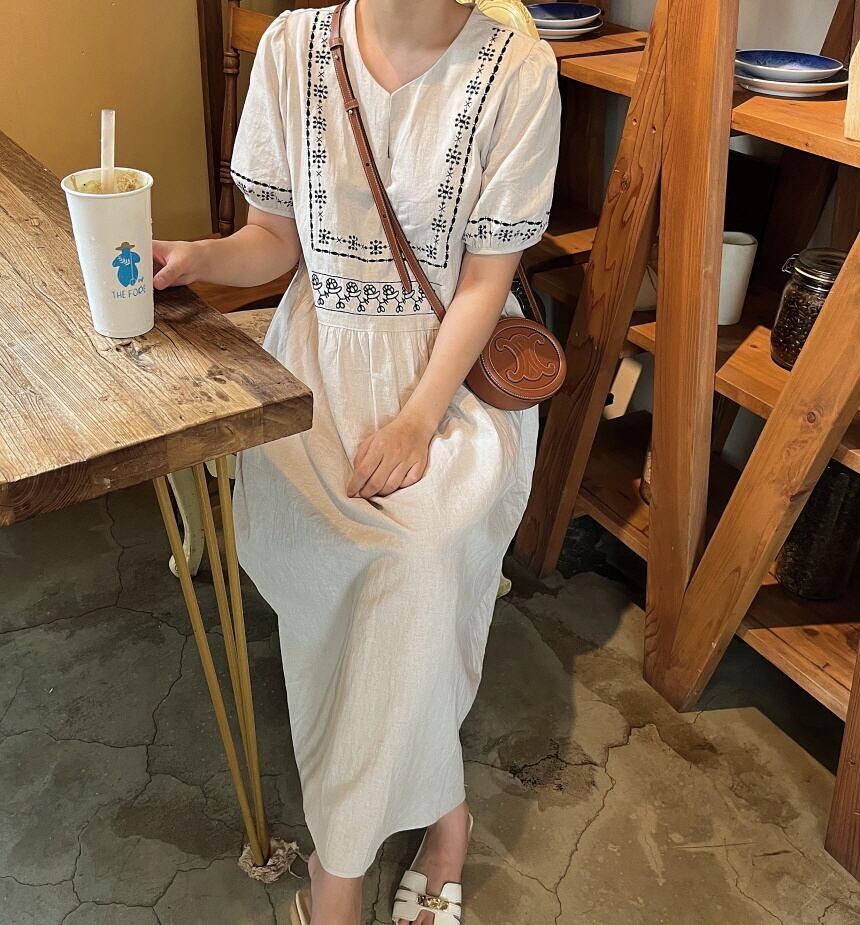 [EWQ] V ネック刺繍ドレスコントラストカラールーズ因果バブルスリーブドレス夏潮 Vestido 9501 レッド サマー 夏物 Vネック