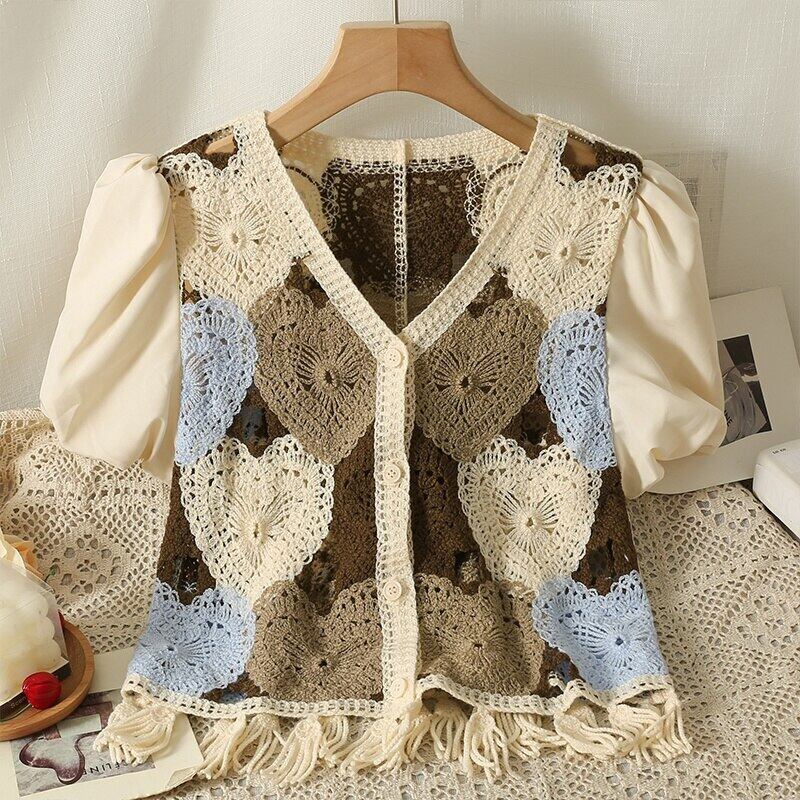 [EWQ] フックドフラワー くり抜きシャツ ニットテル 半袖 コントラスト ブラウス トップス サマータイド ニットトップス 16Y8826 ショート ハーフスリーブ 夏物 フラワーデザイン