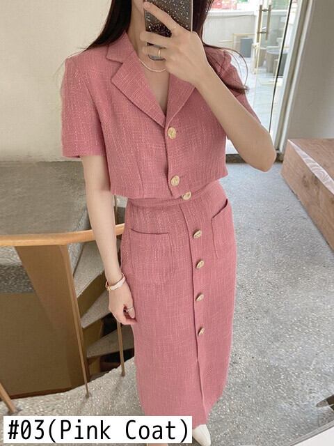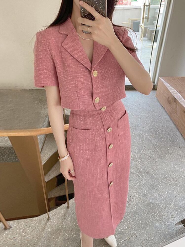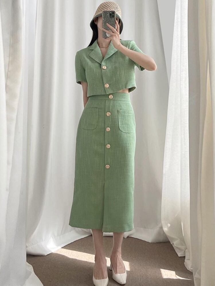 【EWQ】エイブルラペル 薄手ツイード グリーン Sサイズスーツ ショートジャケット+ウエストシックボタンスリムスカート 2点セット 16Y2826