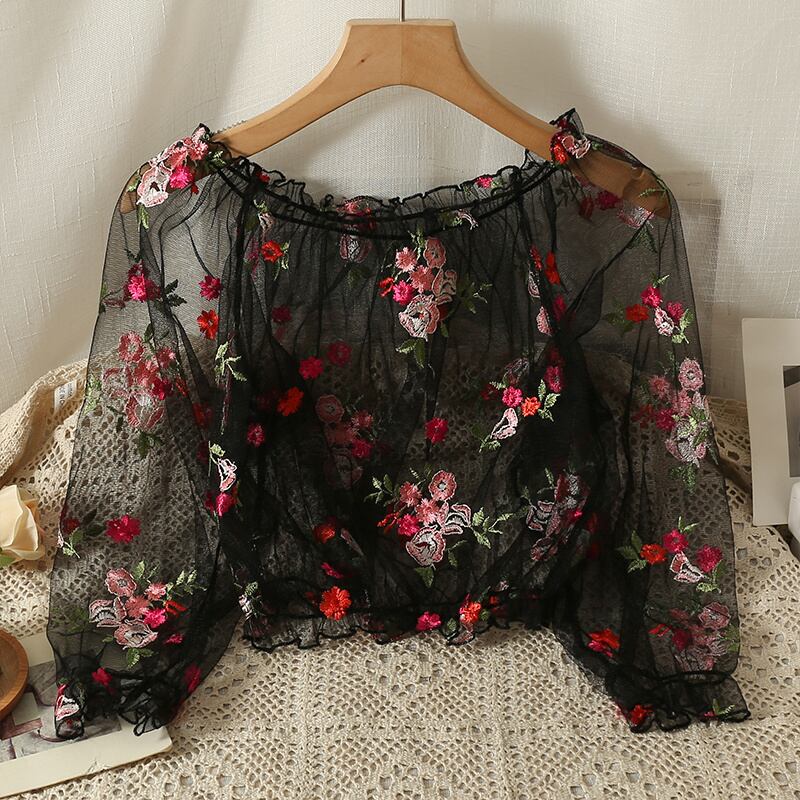 [EWQ] セクシーオフショルダーメッシュ透視シャツ刺繍花コントラスト薄いブラウストップ夏潮トップス 6Y8830 サマー 夏物 フラワーデザイン