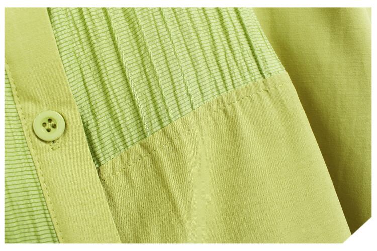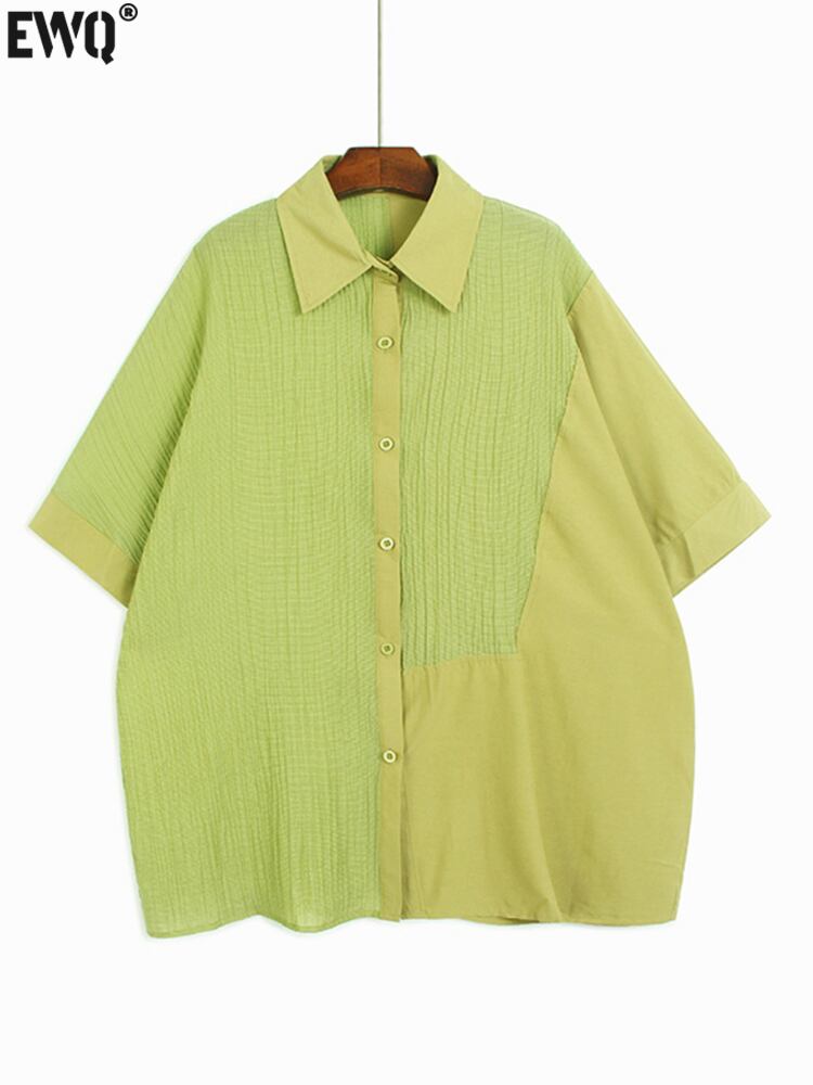 [EWQ] レディース グリーン プリーツ シャツ コントラスト カラー パッチワーク 半袖 オーバーサイズ サマー タイド トップ ショート ハーフスリーブ 夏物