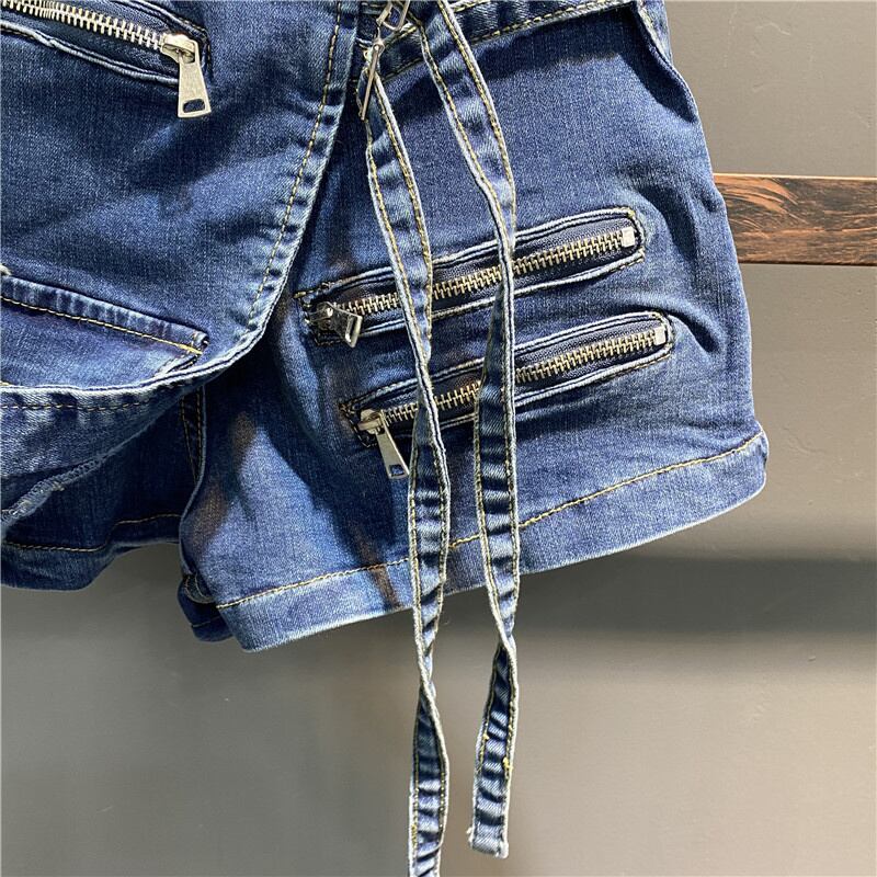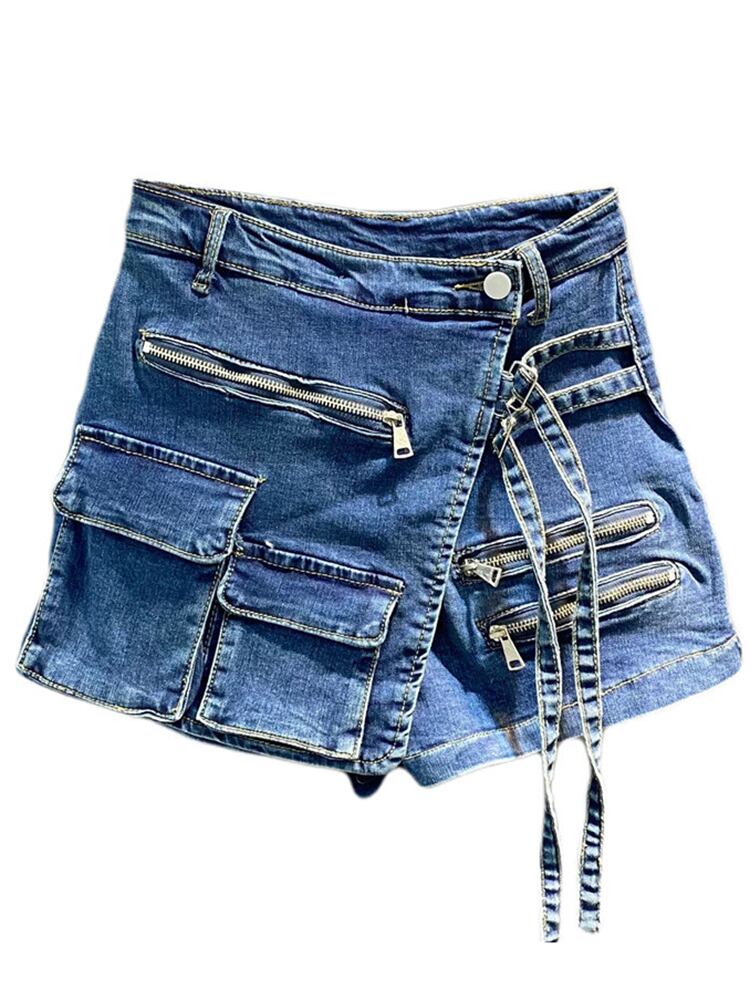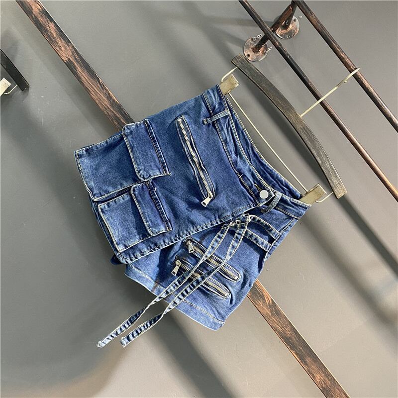 [EWQ] 不規則ポケット ストリート デニム ショート パンツ レディース 夏潮包帯ジッパー スプライス ウエスト ショート ジーンズ サマー 夏物 ショーツ ブルマー