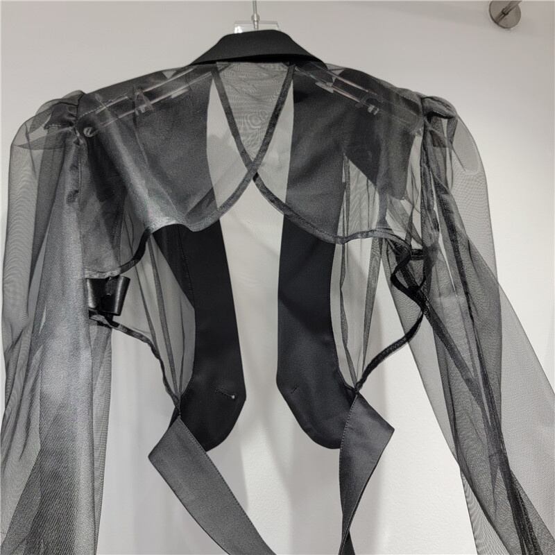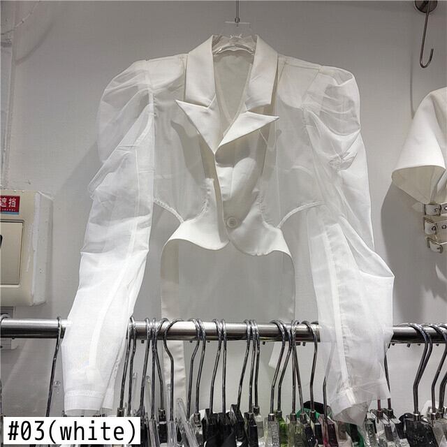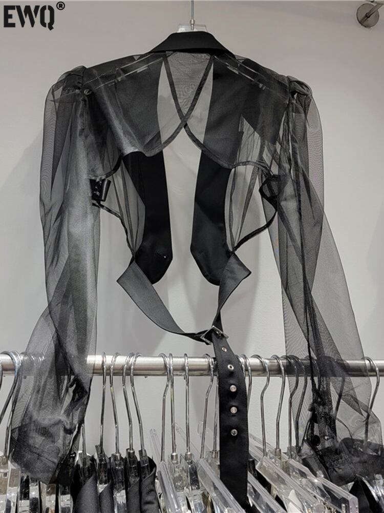 [EWQ] メッシュ透視シャツ長袖パッチワーク薄い包帯 1 つボタン ブラウス夏潮ショート トップス ロング サマー 夏物