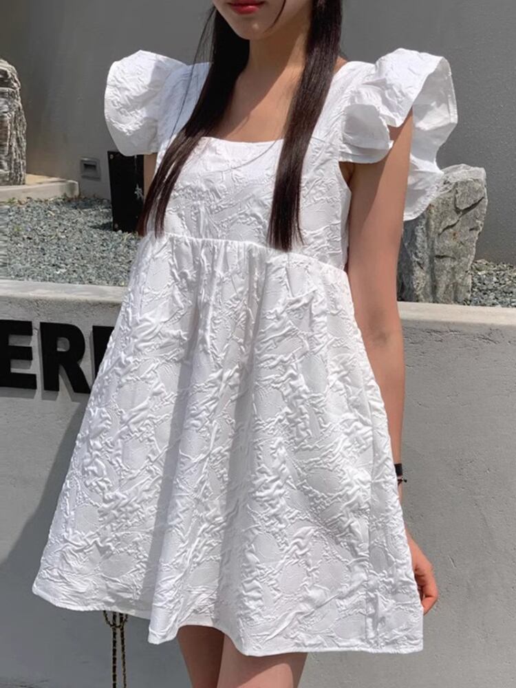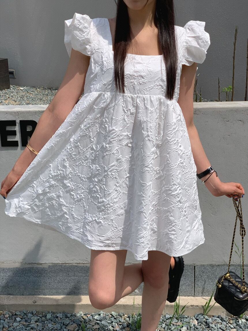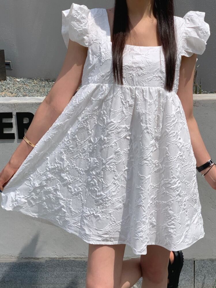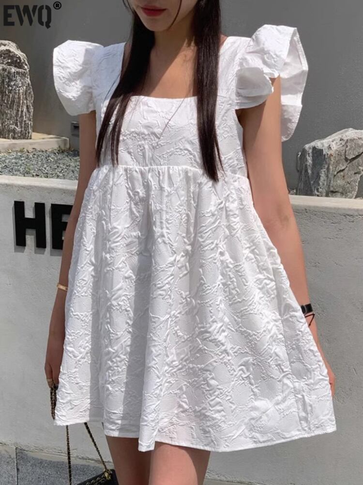 [EWQ] スクエアネックショートドレスジャカードフライングスリーブソリッドカラーミニドレス夏潮 Vestido サマー 夏物 スクウェア