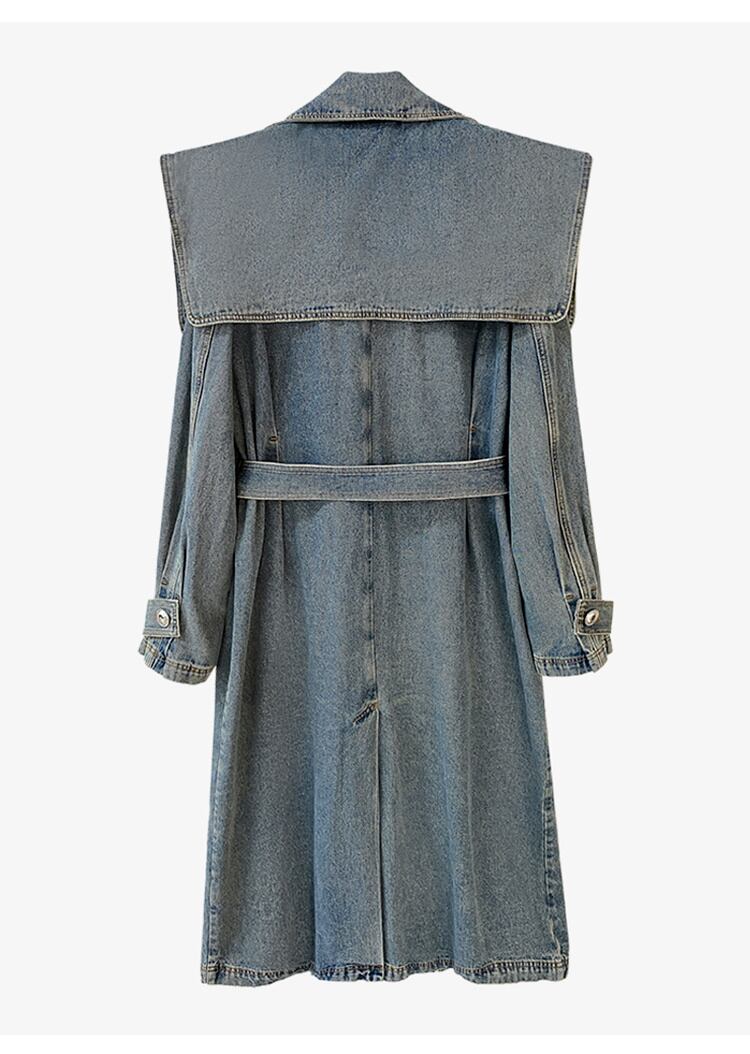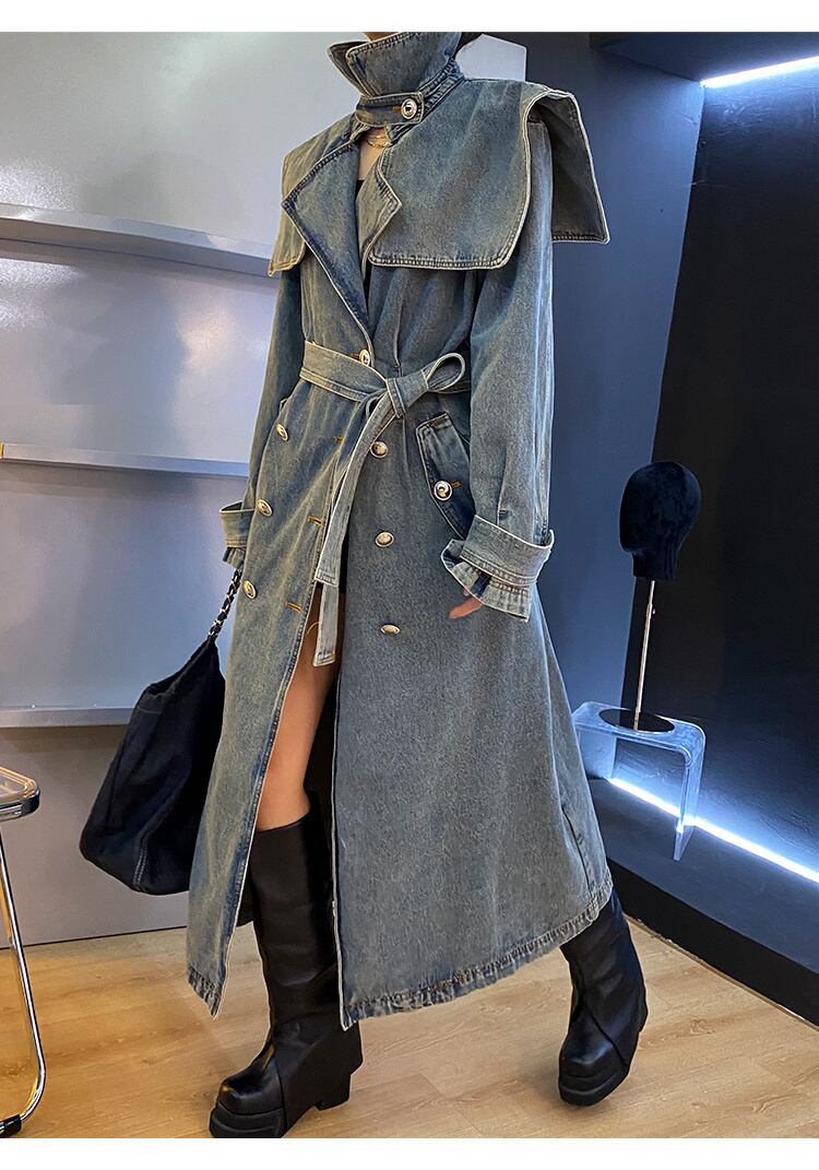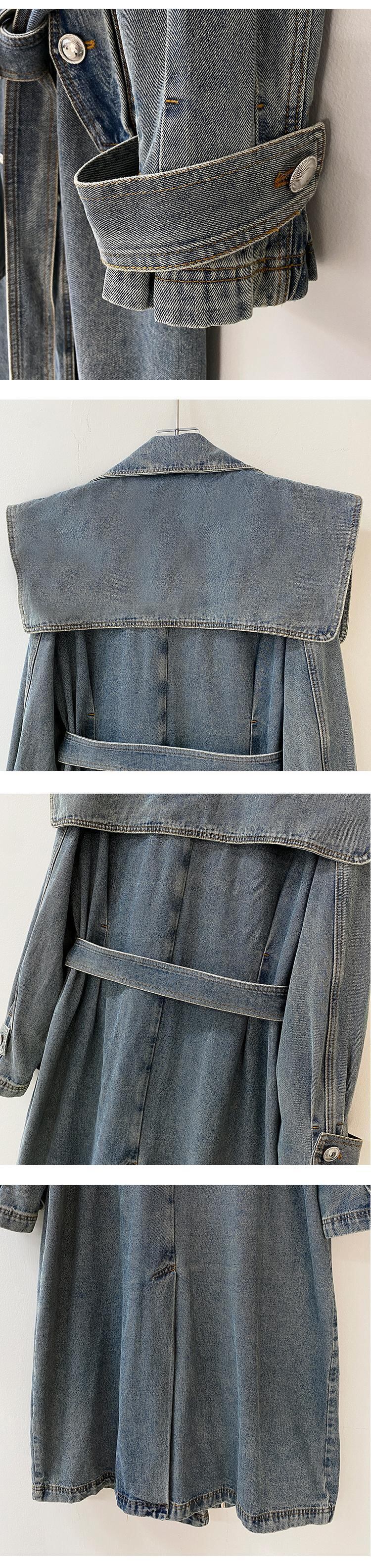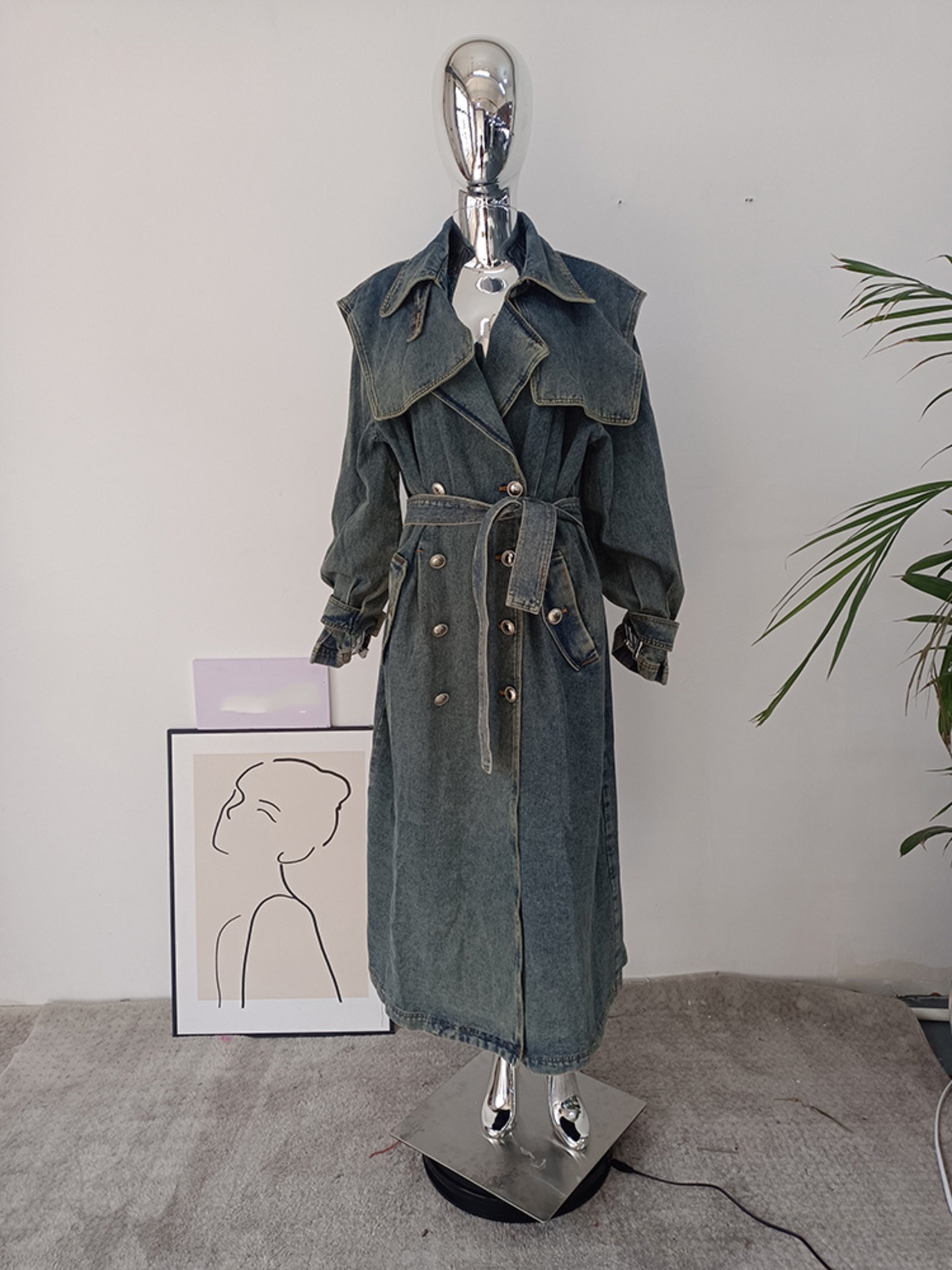 [EWQ] レディース デニム トレンチコート 春 ダブルブレスト レースアップ ルーズ ロング デニム コート オーバーコート スプリング 春物
