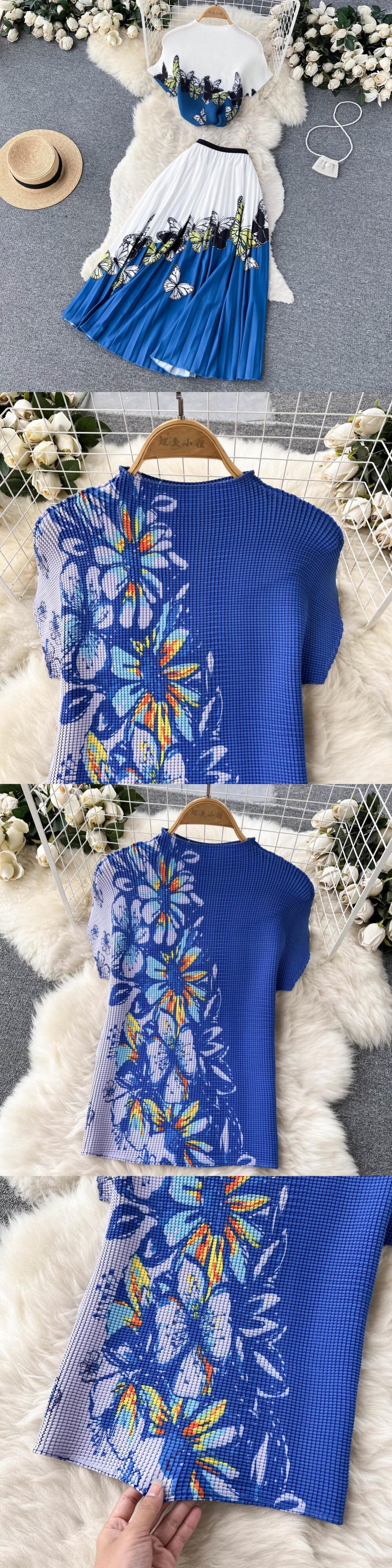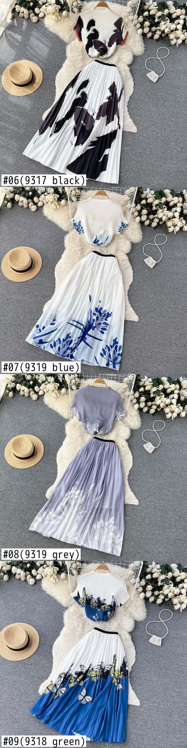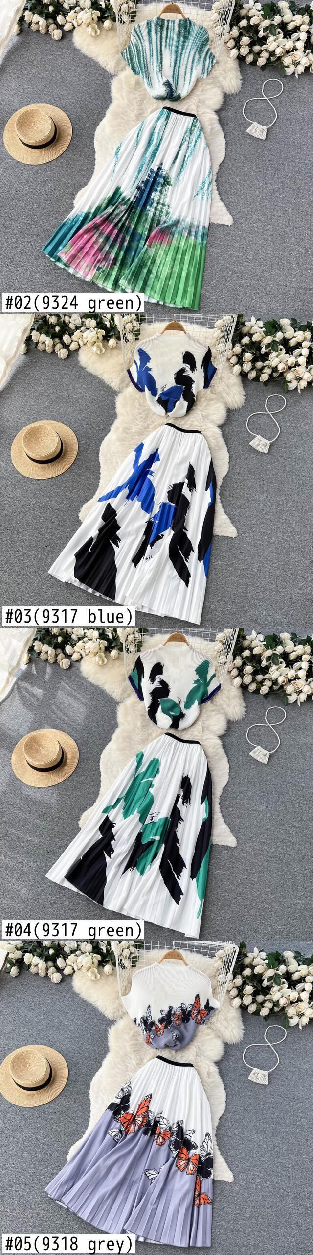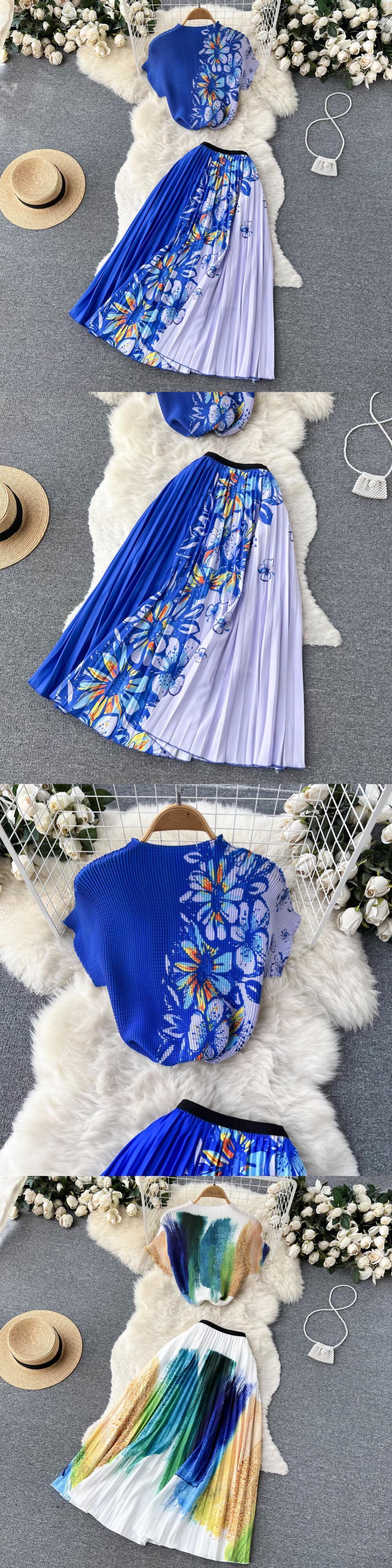 [EWQ] 甘いルーズ 2 点セットグラデーションウエストプリーツスカート夏 20 色プリント Tシャツ美しいパーティースーツ 大人ガーリー スウィート キュート カジュアル サマー 夏物