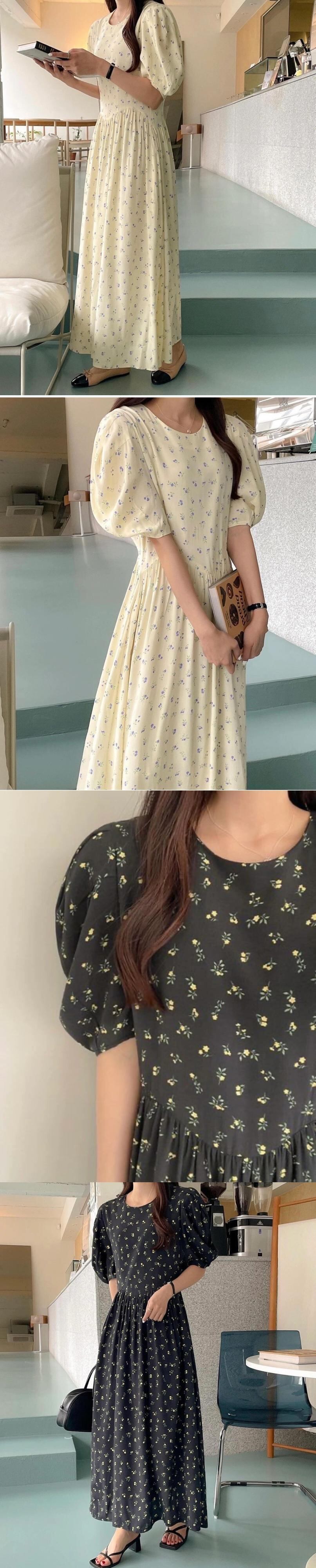 [EWQ] フラワープリーツウエストドレスコントラストカラーバブルスリーブロングドレス夏潮 Vestido サマー 夏物 フラワーデザイン
