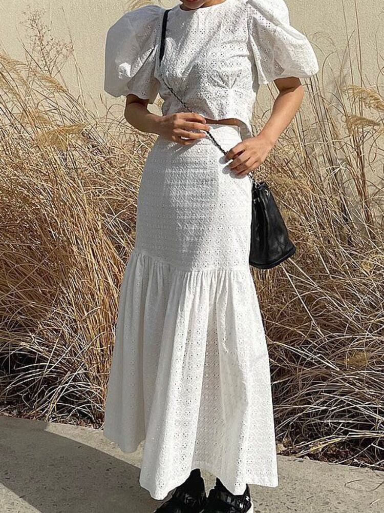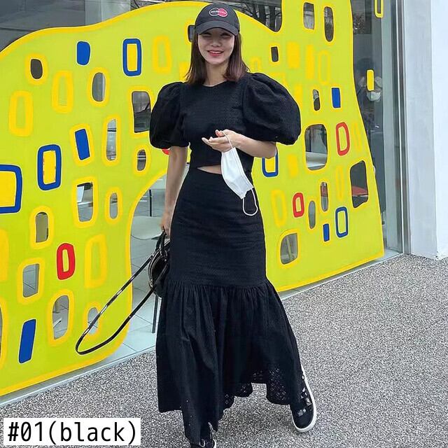 [EWQ] フックフラワー中空ツーピーススーツバブルスリーブシャツ + ウエストスリムフィッシュテールスカートセット夏潮 Y9603 サマー 夏物 フラワーデザイン