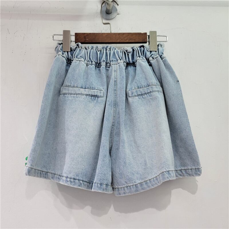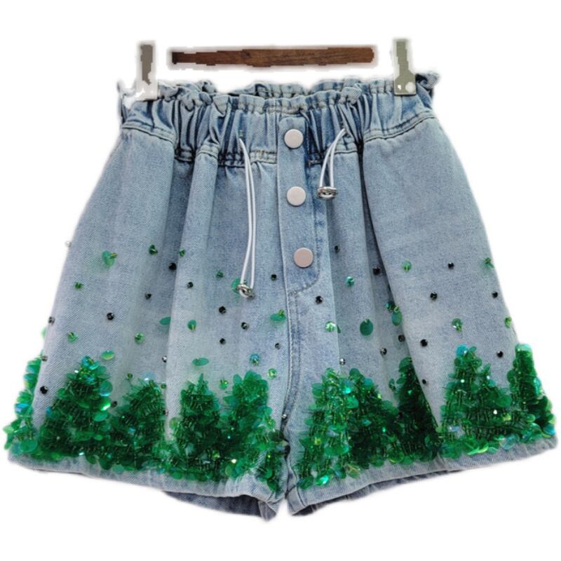 [EWQ] 巾着ウエストデニムショートパンツグリーンビーズボタンワイドレッグホットショートジーンズ夏潮 16Y8815 サマー 夏物 ショーツ ブルマー ワイドパンツ